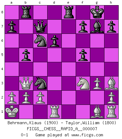 Last move : 0-1 2007 January 16 0:18:10 [Event "FICGS__CHESS__RAPID_A__000007"] [Site "FICGS"] [Date "2006.12.25"] [Round "1"] [White "Behrmann,Klaus"] [Black "Taylor,William"] [Result "0-1"] [WhiteElo "1900"] [BlackElo "1800"] 1.e4 c5 2.f4 g6 3.d4 cxd4 4.Qxd4 Nf6 5.e5 Nc6 6.Qd3 Ng8 7.Nf3 Nh6 8.Nc3 Bg7 9.Be3 d6 10.O-O-O O-O 11.exd6 exd6 12.Nd5 Ng4 13.Qa3 Be6 14.Bg1 Re8 15.Kb1 Bxd5 16.Rxd5 Nf6 17.Rd1 Ne4 18.f5 gxf5 19.Qb3 b5 20.g3 Rb8 21.Ka1 Qc7 22.Bh3 Nc3 0-1 Sicilian : Grand Prix attack Queenside Castling by player White (move 10) Kingside Castling by player Black (move 10) Player Black won this chess game. Follow this game move after move (download)One of these modest little moves may be more embarrassing to your opponent than the biggest threat. (Siegbert Tarrasch) Kein Großmeister ist normal. Sie unterscheiden sich nur im Ausmaß Ihrer Verrücktheit. (Viktor Kortschnoi) Un sacrificio se refuta mucho mejor al aceptarlo. (Wilhelm Steinitz) Je crois qu'il existe des manières très spécifiques de jouer efficacement contre une machine. Evidemment, nous n'avons aucune chance en technique pure, parce que l'ordinateur calcule de manière parfaite. Mais lorsque nous faisons appel à notre cerveau, en utilisant l'intuition et la compréhension, alors nous restons beaucoup plus forts. (Anatoli Karpov) Somehow our devils are never quite what we expect when we meet them face to face. (Nelson DeMille)