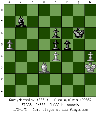 Last move : 1/2-1/2 2012 November 19 16:55:58 [Event "FICGS__CHESS__CLASS_M__000046"] [Site "FICGS"] [Date "2011.07.03"] [Round "1"] [White "Gazi,Miroslav"] [Black "Alcala,Alvin"] [Result "1/2-1/2"] [WhiteElo "2234"] [BlackElo "2235"] 1.Nf3 c5 2.c4 Nf6 3.Nc3 Nc6 4.d4 cxd4 5.Nxd4 g6 6.g3 Bg7 7.Bg2 O-O 8.e3 d6 9.O-O Bd7 10.b3 a6 11.Bb2 Qa5 12.Qd2 Rab8 13.Rfd1 Rfc8 14.Nce2 Qxd2 15.Rxd2 b5 16.cxb5 axb5 17.Rc1 Nd8 18.Rxc8 Rxc8 19.Rc2 Rxc2 20.Nxc2 Ne6 21.Bc3 Nc5 22.Ba5 Kf8 23.Nc3 Ng4 24.h3 Bxc3 25.Bxc3 Ne5 26.e4 g5 27.Kf1 h5 28.Ke2 h4 29.Nb4 hxg3 30.fxg3 Bc8 31.Bxe5 dxe5 32.Nd3 Nxd3 33.Kxd3 Bb7 34.a4 bxa4 35.bxa4 f5 36.h4 gxh4 37.gxh4 Kg7 38.Ke3 e6 39.a5 Kf6 40.Kf2 Bc8 41.Bf1 Bb7 42.Bd3 Kg6 43.Kf3 Kh5 44.Kg3 Kg6 45.Kh3 Kf6 46.Kg3 Kg6 47.Kg2 Kh5 48.Kh3 Kg6 1/2-1/2 Reti Opening Kingside Castling by player Black (move 7) Kingside Castling by player White (move 9) 10 pieces endgame at move 37 : White KBPPP , Black KBPPP WHITE : King + 1 Bishop 3 Pawns BLACK : King + 1 Bishop 3 Pawns This chess game ended in a draw. Follow this game move after move (download)Life is a kind of Chess, with struggle, competition, good and ill events. (Benjamin Franklin) Strategie ist, wie man ein Mädchen auf den Rücksitz bekommt. Taktik ist, was man tut, wenn man dann dort ist. (Anonymous) Vive, pierde y aprende al observar a tu oponente como gana. (Amber Steenbock) Ce n'est pas pour s'amuser qu'il joue aux échecs : il célèbre un culte. (Vladimir Nabokov) The smarter you play, the luckier you'll be. (Mark Pilarski)