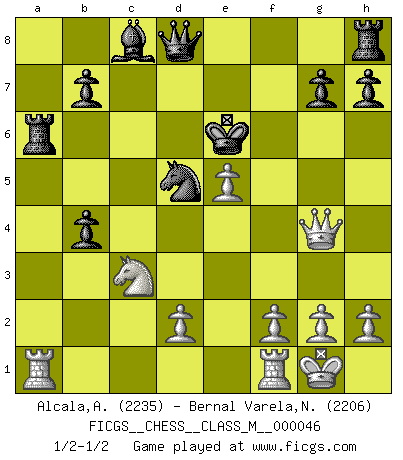 Last move : 1/2-1/2 2011 November 11 5:39:45 [Event "FICGS__CHESS__CLASS_M__000046"] [Site "FICGS"] [Date "2011.07.03"] [Round "1"] [White "Alcala,Alvin"] [Black "Bernal Varela,Nelson"] [Result "1/2-1/2"] [WhiteElo "2235"] [BlackElo "2206"] 1.e4 c5 2.b4 cxb4 3.a3 e5 4.Nf3 Nc6 5.Bc4 Nf6 6.Qe2 Bc5 7.axb4 Nxb4 8.Bxf7+ Kxf7 9.Qc4+ d5 10.Qxc5 a5 11.Nxe5+ Ke6 12.O-O Kxe5 13.c3 Na6 14.Qd4+ Ke6 15.e5 Ng8 16.c4 Ne7 17.Nc3 Nb4 18.Ba3 Ra6 19.Bxb4 axb4 20.cxd5+ Nxd5 21.Qg4+ 1/2-1/2 Sicilian : wing gambit, Marshall variation Kingside Castling by player White (move 12) This chess game ended in a draw. Follow this game move after move (download)Could we look into the head of a Chess player, we should see there a whole world of feelings, images, ideas, emotion and passion. (Alfred Binet) Der Knackpunkt bei der Konzentration ist, daß wir nur durch sie etwas Neues und Ungewöhnliches am Schachbrett finden können. Sie ist der einzige Weg durch neue neue Ideen eine Überraschung zu bereiten. (Garry Kasparov) Si el Ajedrez es una ciencia, es la mas inexacta. Si el Ajedrez es un arte, es demasiado inexacto para ser visto como tal. Si el Ajedrez es un deporte, es demasiado esotérico. Si el Ajedrez es un juego, es demasiado exigente para ser solo un juego. Si el Ajedrez es una aventura, es una muy demandante. Si el Ajedrez es una pasión, es una muy gratificante. Si el Ajedrez es la vida, es una muy triste. (Anónimo) Shah mat. Le roi est mort. Cri de fierté d'un joueur venant de terrasser son adversaire, courtoisement, sans effusion de sang. You lose, general Kenobi. (General Grievous in Star Wars ep.3)