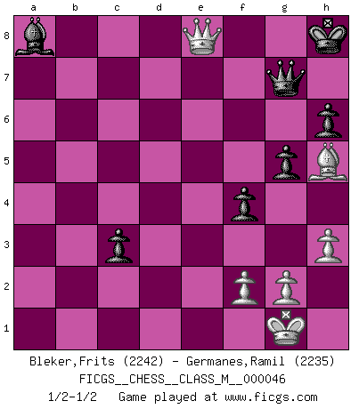 Last move : 1/2-1/2 2011 October 8 13:21:26 [Event "FICGS__CHESS__CLASS_M__000046"] [Site "FICGS"] [Date "2011.07.03"] [Round "1"] [White "Bleker,Frits"] [Black "Germanes,Ramil"] [Result "1/2-1/2"] [WhiteElo "2242"] [BlackElo "2235"] 1.Nf3 Nf6 2.c4 e6 3.Nc3 d5 4.d4 c6 5.Bg5 h6 6.Bh4 dxc4 7.e4 g5 8.Bg3 b5 9.Be2 Bb7 10.O-O Nbd7 11.Ne5 Bg7 12.Nxd7 Nxd7 13.Bd6 a6 14.a4 e5 15.Bg4 exd4 16.e5 c5 17.Re1 Nxe5 18.Bxe5 O-O 19.Bxg7 Kxg7 20.Ne2 f5 21.Bh5 f4 22.Nxd4 cxd4 23.Re6 Rf6 24.Qe1 Bd5 25.Re7+ Kg8 26.axb5 Qd6 27.h3 axb5 28.Rxa8+ Bxa8 29.Re8+ Rf8 30.Rxf8+ Qxf8 31.Qe6+ Kh8 32.Qe5+ Qg7 33.Qxb5 c3 34.bxc3 dxc3 35.Qe8+ 1/2-1/2 Reti Opening Kingside Castling by player White (move 10) Kingside Castling by player Black (move 18) This chess game ended in a draw. Follow this game move after move (download)Before the endgame, the Gods have placed the middle game. (Siegbert Tarrasch) Ich spiele 70 Eröffnungssysteme. (Viktor Kortschnoi) El jugador de combinación piensa hacia adelante; comienza de la posición dada y trabaja las movidas contundentes en su mente. (Emanuel Lasker) Les pièces de l'échiquier étaient impitoyables. Elles le retenaient, elles l'absorbaient. Il y avait de l'horreur en cela, mais aussi une harmonie unique. Car, qu'y a-t-il dans le monde, à part les échecs ? (V. Nabokov) Pretend inferiority and encourage his arrogance. (Sun Tzu)