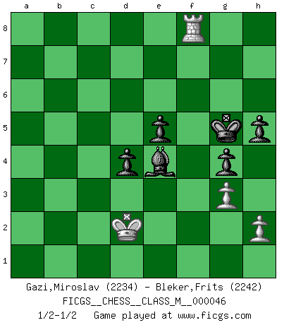 Last move : 1/2-1/2 2012 March 4 13:59:38 [Event "FICGS__CHESS__CLASS_M__000046"] [Site "FICGS"] [Date "2011.07.03"] [Round "1"] [White "Gazi,Miroslav"] [Black "Bleker,Frits"] [Result "1/2-1/2"] [WhiteElo "2234"] [BlackElo "2242"] 1.Nf3 Nf6 2.c4 e6 3.Nc3 d5 4.d4 c6 5.g3 Nbd7 6.Qd3 Be7 7.Bg2 O-O 8.O-O b6 9.Rd1 a5 10.b3 Ba6 11.Bb2 b5 12.cxb5 cxb5 13.Nxb5 a4 14.bxa4 Nb6 15.Qb3 Nxa4 16.Qxa4 Qb6 17.Ne5 Bxb5 18.Qb3 Qa6 19.Rdc1 Bxe2 20.a4 Rfb8 21.Qc2 Bd6 22.Ba3 Bxe5 23.dxe5 Bd3 24.Qc6 Ne4 25.Qxa6 Rxa6 26.Bxe4 Bxe4 27.Bd6 Rba8 28.a5 g5 29.Bc7 g4 30.Kf1 Kg7 31.Ke2 f6 32.exf6+ Kxf6 33.Ra3 e5 34.Rc5 Bg2 35.Rb3 Kf5 36.Bb6 Rb8 37.Kd2 h5 38.Rbc3 Be4 39.Rc8 Raxb6 40.axb6 Rxb6 41.R3c6 Rb2+ 42.Kc3 Rxf2 43.Rf8+ Kg5 44.Rxf2 d4+ 45.Kd2 Bxc6 46.Rf8 Be4 1/2-1/2 Reti Opening Kingside Castling by player Black (move 7) Kingside Castling by player White (move 8) 10 pieces endgame at move 45 : White KRPP , Black KBPPPP WHITE : King + 1 Rook 2 Pawns BLACK : King + 1 Bishop 4 Pawns This chess game ended in a draw. Follow this game move after move (download)That's what Chess is all about. One day you give your opponent a lesson, the next day he gives you one. (Bobby Fischer) Schach ist Krieg, im Schach geht es um testosterongesteuerte Urschreie. (Garry Kasparov) Del Ajedrez se ha dicho que la vida no es lo suficientemente larga para él, pero eso es culpa de la vida, no del Ajedrez. (William Ewart Napier) Les Echecs sont affaire de jugement sensible. Savoir quand frapper et quand esquiver. (Fischer) There are two types of people in this world, good and bad. The good sleep better, but the bad seem to enjoy the waking hours much more. (Woody Allen)