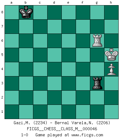 Last move : 1-0 2012 May 18 9:18:59 [Event "FICGS__CHESS__CLASS_M__000046"] [Site "FICGS"] [Date "2011.07.03"] [Round "1"] [White "Gazi,Miroslav"] [Black "Bernal Varela,Nelson"] [Result "1-0"] [WhiteElo "2234"] [BlackElo "2206"] 1.Nf3 Nf6 2.c4 g6 3.Nc3 c5 4.d4 cxd4 5.Nxd4 Nc6 6.g3 Bg7 7.Bg2 Qb6 8.e3 d6 9.O-O O-O 10.b3 Bd7 11.Bb2 Rfd8 12.Qd2 Rac8 13.Rfd1 Nxd4 14.Qxd4 Bc6 15.Qxb6 axb6 16.Rab1 Kf8 17.Ne2 Ne4 18.f4 b5 19.cxb5 Bxb5 20.Bxg7+ Kxg7 21.Bxe4 Bxe2 22.Rdc1 b6 23.Kf2 Bg4 24.a4 d5 25.Bd3 Be6 26.b4 d4 27.Rxc8 Rxc8 28.exd4 Rc3 29.Be4 h6 30.Ra1 Bc4 31.a5 bxa5 32.bxa5 Ba6 33.Bg2 Rc2+ 34.Kg1 Kf8 35.h4 Ke8 36.Bf1 Rc6 37.d5 Rd6 38.Bxa6 Rxa6 39.Kf2 Kd7 40.Ke3 e6 41.dxe6+ Kxe6 42.Kd4 Kd7 43.Ra3 h5 44.Kc4 Kc7 45.Kb5 Re6 46.Rc3+ Kb7 47.Rc5 Re3 48.Rg5 Kc7 49.f5 Re5+ 50.Kb4 f6 51.Rxg6 Rxf5 52.Rg7+ Kb8 53.a6 Rf3 54.Kc5 Ra3 55.a7+ Ka8 56.Kd4 Ra5 57.Rg6 Ra3 58.Ke4 Kxa7 59.Kf4 Ra6 60.Kf5 Kb8 61.Rxf6 Ra5+ 62.Kg6 Ra3 63.Kxh5 Rxg3 64.Rg6 1-0 Reti Opening Kingside Castling by player White (move 9) Kingside Castling by player Black (move 9) 10 pieces endgame at move 51 : White KRPPPP , Black KRPP WHITE : King + 1 Rook 4 Pawns BLACK : King + 1 Rook 2 Pawns 9 pieces endgame at move 51 : White KRPPP , Black KRPP WHITE : King + 1 Rook 3 Pawns BLACK : King + 1 Rook 2 Pawns 8 pieces endgame at move 58 : White KRPP , Black KRPP WHITE : King + 1 Rook 2 Pawns BLACK : King + 1 Rook 2 Pawns 7 pieces endgame at move 61 : White KRPP , Black KRP WHITE : King + 1 Rook 2 Pawns BLACK : King + 1 Rook 1 Pawn 6 pieces endgame at move 63 : White KRPP , Black KR WHITE : King + 1 Rook 2 Pawns BLACK : King + 1 Rook 5 pieces endgame at move 63 : White KRP , Black KR WHITE : King + 1 Rook 1 Pawn BLACK : King + 1 Rook Player White won this chess game. Follow this game move after move (download)If cunning alone were needed to excel, women would be the best Chess players. (Albin) Ich kämpfe solange mein Gegner einen Fehler machen kann. (Emanuel Lasker) Puntos débiles o agujeros en la posición de tu oponente deben de ser ocupados por piezas, no Peones. (Siegbert Tarrasch) Il n'y a pas de prix trop élevé au scalp de l'ennemi. (Koblentz) You can think I'm wrong, but that's no reason to quit thinking. (Gregory House, House M.D.)