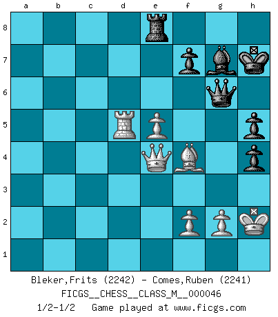 Last move : 1/2-1/2 2011 August 27 15:50:30 [Event "FICGS__CHESS__CLASS_M__000046"] [Site "FICGS"] [Date "2011.07.03"] [Round "1"] [White "Bleker,Frits"] [Black "Comes,Ruben"] [Result "1/2-1/2"] [WhiteElo "2242"] [BlackElo "2241"] 1.d4 Nf6 2.c4 e6 3.Nf3 c6 4.Nc3 d5 5.Bg5 h6 6.Bh4 dxc4 7.e4 g5 8.Bg3 b5 9.Ne5 Nbd7 10.Nxc6 Qb6 11.d5 Bb7 12.a4 a6 13.Be2 Bxc6 14.dxc6 Qxc6 15.e5 Nd5 16.Nxd5 exd5 17.O-O Nc5 18.axb5 axb5 19.Rxa8+ Qxa8 20.Bf3 Bg7 21.Bxd5 Qc8 22.b3 cxb3 23.Qe2 Qd7 24.Rd1 O-O 25.Bxb3 Qe7 26.Qxb5 Nxb3 27.Qxb3 h5 28.h4 gxh4 29.Bf4 Qe6 30.Rd5 Qg4 31.Qe3 Re8 32.Kh2 Kh7 33.Qe4+ Qg6 1/2-1/2 Queen's pawn game Kingside Castling by player White (move 17) Kingside Castling by player Black (move 24) This chess game ended in a draw. Follow this game move after move (download)In Fischer's hands, a slight theoretical advantage is as good a being a Queen ahead. (Isaac Kashdan) Kasparov stellt für gewöhnlich die Regeln auf und bricht sie dann selbst wieder. (Alexej Shirov) La captura del Rey enemigo es la finalidad pero no el primer objetivo de la partida. (William Steinitz) Dans le domaine de la peinture, de la gravure et de la sculpture, dès la première décennie de notre siècle, les artistes abandonnent la représentation de la partie d'échecs pour se concentrer sur les pièces, sur les échiquiers et sur toutes les variations auxquelles les unes et les autres peuvent donner lieu. On passe en quelque sorte d'un thème social à un thème musical (au sens de la musica médiévale, c'est-à-dire d'une notion qui inclue le rythme, l'harmonie, la construction et la déconstruction, etc.). Graphiquement et picturalement, l'échiquier apparaît comme une structure ouverte, dynamique, d'une richesse infinie, autorisant toutes les combinatoires et débouchant sur des mouvements et des rythmes de nature exponentielle. (Michel Pastoureau) The hypothalamus is one of the most important parts of the brain, involved in many kinds of motivation, among other functions. The hypothalamus controls the 'Four Fs: Fighting, Fleeing, Feeding and Mating. (Unknown author)
