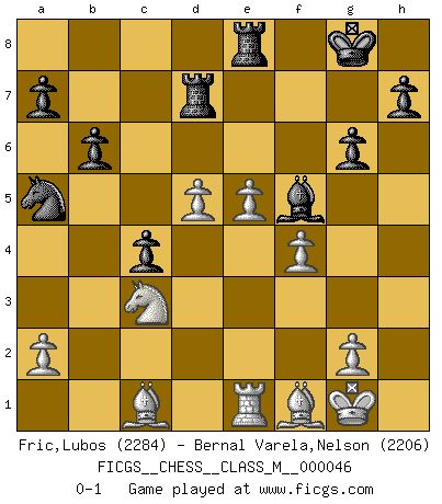 Last move : 0-1 2012 January 25 18:34:3 [Event "FICGS__CHESS__CLASS_M__000046"] [Site "FICGS"] [Date "2011.07.03"] [Round "1"] [White "Fric,Lubos"] [Black "Bernal Varela,Nelson"] [Result "0-1"] [WhiteElo "2284"] [BlackElo "2206"] 1.d4 Nf6 2.c4 g6 3.Nc3 d5 4.cxd5 Nxd5 5.e4 Nxc3 6.bxc3 Bg7 7.Bc4 O-O 8.Ne2 b6 9.h4 Nc6 10.h5 Na5 11.Bd3 e5 12.hxg6 fxg6 13.Be3 Rf7 14.O-O exd4 15.cxd4 c5 16.d5 Qh4 17.f3 Be5 18.f4 Bxa1 19.Qxa1 Bg4 20.Nc3 Re8 21.e5 Qg3 22.Qe1 Qxe1 23.Rxe1 c4 24.Bf1 Bf5 25.Bc1 Rd7 0-1 This chess game has been lost on time (started : 2011.07.03 0:20:50) King's Indian defense, 3.Nc3 Kingside Castling by player Black (move 7) Kingside Castling by player White (move 14) Player Black won this chess game. Follow this game move after move (download)No price is too great for the scalp of the enemy King. (Koblentz) Schach wird sich dank seiner hohen kulturellen Tradition immer durchsetzen. In näherer Zukunft womöglich sogar als Gegenreaktion auf die maßlose Reizüberflutung im Freizeit- und Spielbereich. (Garry Kasparov) a manera como él juega al Ajedrez, demuestra la completa naturaleza de un hombre. (Stanley Ellin) Je fais ceci parce que dans cinquante coups j'obtiendrai cela; je m'appelle Mikhail Moisevitch Botvinnik. (Botvinnik) Experiences are the keys to life. (Daniel Parmet)