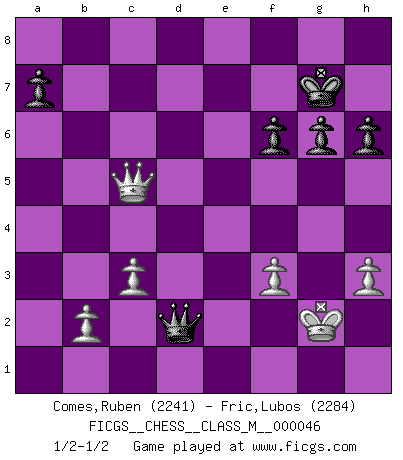 Last move : 1/2-1/2 2012 May 25 15:39:29 [Event "FICGS__CHESS__CLASS_M__000046"] [Site "FICGS"] [Date "2011.07.03"] [Round "1"] [White "Comes,Ruben"] [Black "Fric,Lubos"] [Result "1/2-1/2"] [WhiteElo "2241"] [BlackElo "2284"] 1.d4 Nf6 2.Bf4 d5 3.e3 c5 4.Nd2 Nc6 5.Ngf3 e6 6.c3 Bd6 7.Bg3 O-O 8.dxc5 Bxc5 9.Bd3 Be7 10.Qc2 h6 11.h3 Bd6 12.Bxd6 Qxd6 13.Rd1 b6 14.O-O Bb7 15.Rfe1 Rfd8 16.Qa4 Qc7 17.Qh4 Rac8 18.a4 e5 19.Bf5 Rb8 20.Qg3 g6 21.Bb1 Qe7 22.e4 dxe4 23.Bxe4 Nxe4 24.Nxe4 Kh7 25.Ned2 f6 26.Nh4 Qg7 27.f4 exf4 28.Qxf4 Ne5 29.Ndf3 Rxd1 30.Rxd1 Rf8 31.a5 Nxf3+ 32.Nxf3 bxa5 33.Qa4 Bxf3 34.gxf3 Rf7 35.Qxa5 Rd7 36.Rxd7 Qxd7 37.Qc5 Kg7 38.Kg2 Qd2+ 1/2-1/2 Queen's pawn game Kingside Castling by player Black (move 7) Kingside Castling by player White (move 14) This chess game ended in a draw. Follow this game move after move (download)A great player and a great example for many. His book My 60 Memorable Games had a big impact on me. It is a shame he didn't continue to enrich the world of chess with his unparalleled understanding after 1972. (Jan Timman, about Bobby Fischer's death) Es tut gut, die Entwicklungsperiode von, [...] demokratischem Geist durchdringen zu lassen. Wie undemokratisch wäre es doch beispielsweise, den einen Offizier große Spaziertouren vornehmen zu lassen, während die anderen zu Hause säßen und sich entsetzlich langweilten. (Aaron Nimzowitsch) La vida es como el Ajedrez, con lucha, competición y eventos buenos y malos. (Benjamin Franklin) A chaque perte on perd un peu de soi. (Joël Lautier) Computer Science is no more about computers than astronomy is about telescopes. (Edsger W. Dijkstra)