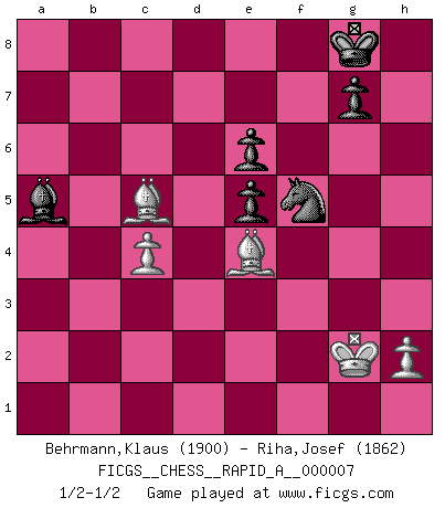 Last move : 1/2-1/2 2007 January 23 15:7:11 [Event "FICGS__CHESS__RAPID_A__000007"] [Site "FICGS"] [Date "2006.12.25"] [Round "1"] [White "Behrmann,Klaus"] [Black "Riha,Josef"] [Result "1/2-1/2"] [WhiteElo "1900"] [BlackElo "1862"] 1.e4 c5 2.Nf3 d6 3.d4 cxd4 4.Nxd4 Nf6 5.Nc3 a6 6.f4 e6 7.Be2 Be7 8.O-O O-O 9.Be3 Nc6 10.Qd2 Qc7 11.Rad1 Na5 12.Qd3 Bd7 13.g4 h6 14.g5 hxg5 15.fxg5 Nh7 16.g6 fxg6 17.Nf3 b5 18.Ne5 dxe5 19.Qxd7 Qxd7 20.Rxd7 Bb4 21.Rxf8+ Nxf8 22.Rc7 Bd6 23.Ra7 Rxa7 24.Bxa7 Nc6 25.Be3 Nd7 26.Nxb5 axb5 27.Bxb5 Ncb8 28.a4 Nc5 29.Kg2 Nxe4 30.a5 Nc5 31.b4 Ne4 32.Bd3 Bxb4 33.Bxe4 Bxa5 34.Bxg6 Nc6 35.c4 Ne7 36.Be4 Nf5 37.Bc5 1/2-1/2 Sicilian : Najdorf, 6.f4 Kingside Castling by player White (move 8) Kingside Castling by player Black (move 8) This chess game ended in a draw. Follow this game move after move (download)Fischer was a master of clarity and a king of artful positioning. His opponents would see where he was going but were powerless to stop him. (Bruce Pandolfini) Wenn ein Kopf und ein Buch zusammenstoßen und es klingt hohl, ist es denn allemal im Buche? (Georg Christoph Lichtenberg) Después de la respuesta de las negras a 1.e4 con 1..e5, se quedan siempre tratando de entrar dentro del juego. (Howard Staunton) Comme les marins qui ont mille raisons différentes d'aller en mer, les joueurs d'échecs en ont tout autant avant de s'installer devant une table et jouer... (Vincent Bertignac, philosophe) All art requires courage. (Anne Tucker)