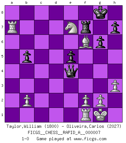 Last move : 1-0 2007 January 31 19:24:15 [Event "FICGS__CHESS__RAPID_A__000007"] [Site "FICGS"] [Date "2006.12.25"] [Round "1"] [White "Taylor,William"] [Black "Oliveira,Carlos"] [Result "1-0"] [WhiteElo "1800"] [BlackElo "2027"] 1.e4 c6 2.d4 d6 3.Nc3 Qc7 4.Nf3 e5 5.Bc4 Be7 6.dxe5 dxe5 7.Ng5 Nh6 8.a4 O-O 9.h3 Kh8 10.O-O f6 11.Ne6 Bxe6 12.Bxe6 Nf7 13.Qh5 g6 14.Qe2 Nd7 15.Be3 Nc5 16.Bxf7 Rxf7 17.Qc4 Kg7 18.Bxc5 b5 19.axb5 cxb5 20.Qd5 Rd8 21.Bxe7 Rxd5 22.Nxd5 Qxc2 23.Rxa7 Qxe4 24.Bxf6+ Kg8 25.Ne7+ 1-0 Caro-Kann defense Kingside Castling by player Black (move 8) Kingside Castling by player White (move 10) Player White won this chess game. Follow this game move after move (download)You are for me the Queen on d8 and I am the Pawn on d7 !! (Eduard Gufeld) Ein Teil des Fehlers ist immer korrekt. (Savielly Grigorievitsch Tartakower) Dejen al perfeccionista jugar por correo. (Yasser Seirawan) Shah mat. Le roi est mort. Cri de fierté d'un joueur venant de terrasser son adversaire, courtoisement, sans effusion de sang. No, no, you're not thinking; you're just being logical. (Niels Bohr)