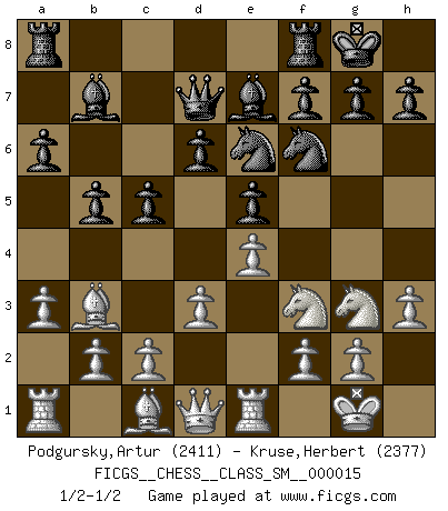 Last move : 1/2-1/2 2011 July 6 20:34:32 [Event "FICGS__CHESS__CLASS_SM__000015"] [Site "FICGS"] [Date "2011.07.03"] [Round "1"] [White "Podgursky,Artur"] [Black "Kruse,Herbert"] [Result "1/2-1/2"] [WhiteElo "2411"] [BlackElo "2377"] 1.e4 e5 2.Nf3 Nc6 3.Bb5 a6 4.Ba4 Nf6 5.O-O Be7 6.Re1 b5 7.Bb3 O-O 8.h3 Bb7 9.d3 d6 10.a3 Qd7 11.Nbd2 Nd8 12.Nf1 Ne6 13.Ng3 c5 1/2-1/2 Ruy Lopez : Closed, 7...O-O Kingside Castling by player White (move 5) Kingside Castling by player Black (move 7) This chess game ended in a draw. Follow this game move after move (download)A Chess game is a dialogue, a conversation between a player and his opponent. Each move by the opponent may contain threats or be a blunder, but a player cannot defend against threats or take advantage of blunders if he does not first ask himself: What is my opponent planning after each move ? (Bruce A. Moon) In Buenos Aires ist es nicht mein vorrangiges Ziel ein starkes Turnier zu organisieren, sondern ein Turnier für Gentlemen. Ich würde nie Kamsky einladen. Ich mag keine Probleme. (Miguel Najdorf) La maestría del Ajedrez consiste esencialmente en analizar posiciónes de Ajedrez con precisión. (Mikhail Botvinnik) Comme les marins qui ont mille raisons différentes d'aller en mer, les joueurs d'échecs en ont tout autant avant de s'installer devant une table et jouer... (Vincent Bertignac, philosophe) Wisdom is the reward you get for a lifetime of listening when you'd have preferred to talk. (Doug Larson)