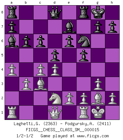 Last move : 1/2-1/2 2011 July 19 21:47:16 [Event "FICGS__CHESS__CLASS_SM__000015"] [Site "FICGS"] [Date "2011.07.03"] [Round "1"] [White "Laghetti,Gaetano"] [Black "Podgursky,Artur"] [Result "1/2-1/2"] [WhiteElo "2363"] [BlackElo "2411"] 1.d4 Nf6 2.c4 e6 3.Nf3 b6 4.g3 Ba6 5.b3 Bb4+ 6.Bd2 Be7 7.Bg2 c6 8.Bc3 d5 9.Ne5 Nfd7 10.Nxd7 Nxd7 11.Nd2 O-O 12.O-O f5 13.a4 Nf6 1/2-1/2 Queen's Indian : Nimzovich variation (exaggerated Fianchetto) Kingside Castling by player Black (move 11) Kingside Castling by player White (move 12) This chess game ended in a draw. Follow this game move after move (download)If you aren't afraid of Spassky, then I have removed the element of money. (Jim Slater) Mit sehr nachdenklichem Gesicht schreitet Bobby durch den Turniersaal. Was ist passiert?, fragt Lombardy. Ich stehe schlecht, antwortet Fischer. Lombardy: Dann biete doch einfach Remis an. Fischer: So schlecht stehe ich nun auch wieder nicht! (Robert James Fischer) El juego de Damas es para vagabundos. (Paul Morphy) Tous ces prétendus hommes politiques sont les pions, les Cavaliers, les Tours ou les Fous d'une partie d'échecs qui se jouera tant qu'un hasard ne renversera pas l'échiquier. (Honoré de Balzac) No enterprise is more likely to succeed than one concealed from the enemy until it is ripe for execution. (Niccolo Machiavelli)