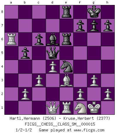 Last move : 1/2-1/2 2011 August 8 20:20:20 [Event "FICGS__CHESS__CLASS_SM__000015"] [Site "FICGS"] [Date "2011.07.03"] [Round "1"] [White "Hartl,Hermann"] [Black "Kruse,Herbert"] [Result "1/2-1/2"] [WhiteElo "2506"] [BlackElo "2377"] 1.e4 e5 2.Nf3 Nc6 3.Bb5 a6 4.Ba4 Nf6 5.O-O Be7 6.Re1 b5 7.Bb3 O-O 8.c3 d5 9.exd5 Nxd5 10.Nxe5 Nxe5 11.Rxe5 c6 12.d4 Bd6 13.Re1 Qh4 14.g3 Qh3 15.Be3 Bg4 16.Qd3 Rae8 17.Nd2 Re6 18.a4 Qh5 19.axb5 axb5 20.Nf1 Bf5 21.Qd2 Rfe8 22.Ra6 Be4 23.Bc2 Nf6 24.Bxe4 Nxe4 25.Qd1 Qd5 1/2-1/2 Ruy Lopez : Closed, 7...O-O Kingside Castling by player White (move 5) Kingside Castling by player Black (move 7) This chess game ended in a draw. Follow this game move after move (download)He who fears an isolated Queen's Pawn should give up Chess. (Siegbert Tarrasch) Das Zentrum ist der Balkan des Schachbretts - Kriegshandlungen können in jedem Moment ausbrechen. (Aaron Nimzowitsch) Las combinaciones han sido siempre el aspecto más intrigante del Ajedrez. Los Maestros las buscan, el público las aplauden, los críticos las alaban. La razón se debe a que las combinaciones hacen posible que el Ajedrez sea más que un ejercicio matemático con una carencia de vida. Ellas son la poesía del juego, son del Ajedrez lo que la melodía es de la música. Ellas representan el triunfo de la mente sobre la materia. (Reuben Fine) Que feriez-vous si vous étiez en train de jouer aux échecs et que la fin du monde arrive ? Je continuerais à jouer. (Saint Borromée) A government big enough to give you everything you want is strong enough to take everything you have. (Thomas Jefferson)