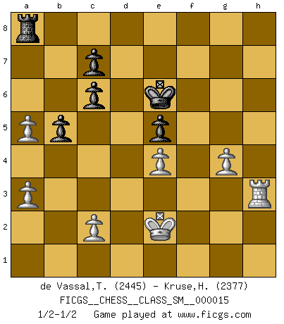 Last move : 1/2-1/2 2011 November 5 23:23:4 [Event "FICGS__CHESS__CLASS_SM__000015"] [Site "FICGS"] [Date "2011.07.03"] [Round "1"] [White "de Vassal,Thibault"] [Black "Kruse,Herbert"] [Result "1/2-1/2"] [WhiteElo "2445"] [BlackElo "2377"] 1.e4 e5 2.Nf3 Nc6 3.Bb5 a6 4.Bxc6 dxc6 5.O-O Bg4 6.d3 Qf6 7.Nbd2 Ne7 8.h3 h5 9.Re1 Ng6 10.d4 Bd6 11.hxg4 hxg4 12.Nh2 Rxh2 13.Qxg4 Rh4 14.Qf5 exd4 15.Nf3 Rh7 16.Bg5 Qe6 17.Qxe6+ fxe6 18.Nxd4 Rh5 19.Be3 Kf7 20.g3 Ne5 21.Kg2 Ng4 22.Nf3 e5 23.Bg5 Bc5 24.Re2 Rf8 25.Rd1 Ke6 26.Bh4 Nxf2 27.Rf1 Rxf3 28.Kxf3 g5 29.b4 Ba7 30.Rexf2 Bxf2 31.Rxf2 gxh4 32.Rh2 h3 33.Kg4 Rh8 34.a3 a5 35.Rxh3 Rg8+ 36.Kf3 Rf8+ 37.Ke2 b5 38.bxa5 Ra8 39.g4 1/2-1/2 Ruy Lopez : Exchange variation, 5.O-O Kingside Castling by player White (move 5) This chess game ended in a draw. Follow this game move after move (download)First-class players lose to second class players because second-class players sometimes play a first-class game. (Tarrasch) Der Schachmeister von Heute braucht Courage, einen Killerinstinkt, Ausdauer und Arroganz. (Larry Evans) Ciertamente, de todas la drogas del mundo, el Ajedrez debe ser el mas placentero permamentemente. (Assiac) Les Echecs sont affaire de jugement sensible. Savoir quand frapper et quand esquiver. (Fischer) If only people were all showed a certain minimum level of niceness; if only people didn't retract verbal draw offers (without draw box ticked) on ficgs; if only people didn't kill; if only people didn't run concentration / extermination camps, if only people didn't drop nuclear bombs on Hiroshima and Nagasaki, and so on - it would be a much more beautiful world. But sadly, things are not so... (Normajean Yates)