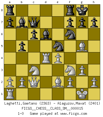 Last move : 1-0 2011 September 22 22:43:22 [Event "FICGS__CHESS__CLASS_SM__000015"] [Site "FICGS"] [Date "2011.07.03"] [Round "1"] [White "Laghetti,Gaetano"] [Black "Alaguzov,Maxat"] [Result "1-0"] [WhiteElo "2363"] [BlackElo "2401"] 1.d4 d5 2.c4 c6 3.Nf3 Nf6 4.e3 e6 5.Nc3 Nbd7 6.Qc2 Bd6 7.Bd3 O-O 8.O-O dxc4 9.Bxc4 b5 10.Be2 Bb7 11.Rd1 Qc7 12.e4 e5 13.Bg5 exd4 14.Rxd4 Ne5 15.g3 1-0 QGD Slav : 4.e3 Kingside Castling by player Black (move 7) Kingside Castling by player White (move 8) Player White won this chess game. Follow this game move after move (download)Chess is above all, a fight ! (Emanuel Lasker) Wenn Schach ein enormer Dschungel ist, der seine Myriaden von Geheimnissen nicht preisgeben will, dann sind Computer die Kettensägen einer gewaltigen ökologisch unsensiblen Nutzholzfirma. (Nigel Short) Los Peones son nacidos libres, y aún así, se encuentran encadenados por todos lados. (Rick Kennedy) Le génie consiste à savoir transgresser les règles au moment opportun. (Teichmann) The various flowers seem good to different people. (Chinese proverb)