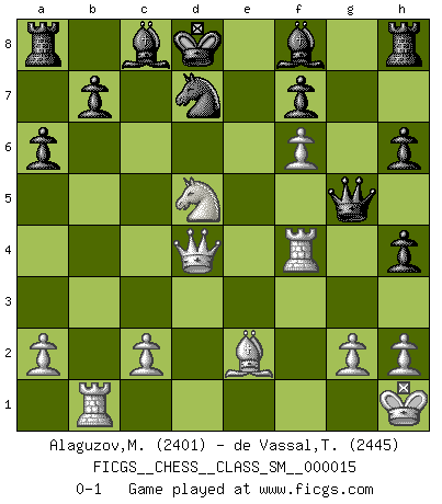 Last move : 0-1 2011 September 22 22:43:22 [Event "FICGS__CHESS__CLASS_SM__000015"] [Site "FICGS"] [Date "2011.07.03"] [Round "1"] [White "Alaguzov,Maxat"] [Black "de Vassal,Thibault"] [Result "0-1"] [WhiteElo "2401"] [BlackElo "2445"] 1.e4 c5 2.Nf3 d6 3.d4 cxd4 4.Nxd4 Nf6 5.Nc3 a6 6.Bg5 e6 7.f4 Qb6 8.Qd2 Qxb2 9.Rb1 Qa3 10.e5 h6 11.Bh4 dxe5 12.fxe5 g5 13.exf6 gxh4 14.Be2 Qa5 15.O-O Nd7 16.Kh1 Qg5 17.Rf4 e5 18.Nd5 exd4 19.Qxd4 Kd8 0-1 Sicilian : Najdorf, 7...Qb6 Kingside Castling by player White (move 15) Player Black won this chess game. Follow this game move after move (download)The boy (then a 12 year old boy named Anatoly Karpov) doesn't have a clue about Chess, and there's no future at all for him in this profession. (Mikhail Botvinnik) Das Schachspiel hat wie die Liebe, die Musik, die Fähigkeit, den Menschen glücklich zu machen. Ich habe ein leises Gefühl des Bedauerns für jeden, der das Schachspiel nicht kennt, so wie ich jeden bedaure, der die Liebe nicht kennt. (Siegbert Tarrasch) El Ajedrez es un regaderazo frío para la mente. (Sir John Simon) Même un GMI sait rarement calculer sur plus de cinq coups une attaque à sacrifices. (Rudolf Spielmann) The worth of a book is to be measured by what you can carry away from it. (James Bryce)