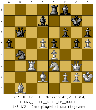 Last move : 1/2-1/2 2011 December 12 22:30:29 [Event "FICGS__CHESS__CLASS_SM__000015"] [Site "FICGS"] [Date "2011.07.03"] [Round "1"] [White "Hartl,Hermann"] [Black "Szczepanski,Zbigniew"] [Result "1/2-1/2"] [WhiteElo "2506"] [BlackElo "2424"] 1.e4 e5 2.Nf3 Nc6 3.Bb5 a6 4.Ba4 Nf6 5.O-O Be7 6.Re1 b5 7.Bb3 O-O 8.c3 d6 9.h3 Bb7 10.d4 Re8 11.Nbd2 Bf8 12.a4 h6 13.Bc2 exd4 14.cxd4 Nb4 15.Bb1 c5 16.d5 Nd7 17.Ra3 g6 18.Nf1 Bg7 19.a5 Qe7 20.Rb3 Kh7 21.Bf4 Rac8 22.Qc1 Nf6 23.Ng3 Qd8 24.h4 Ng4 25.h5 Rc7 26.Bd2 Rce7 27.Qd1 Rc7 28.Bc3 Bc8 29.Qd2 Ne5 30.Nxe5 dxe5 31.Rc1 Bf8 32.Qe3 g5 33.Qf3 Kg8 34.Nf5 Bd7 35.Be1 Rc8 36.Qg4 Kh7 37.Rg3 c4 38.Kh2 Qf6 39.Rf3 Qd8 40.b3 Qxa5 41.Qg3 Qd8 42.bxc4 Rxc4 43.Rxc4 bxc4 44.Ne3 Kg7 45.Nxc4 Qc7 46.Rc3 a5 47.Bd2 f6 48.Ne3 Qb6 1/2-1/2 Ruy Lopez : Closed, 7...O-O Kingside Castling by player White (move 5) Kingside Castling by player Black (move 7) This chess game ended in a draw. Follow this game move after move (download)Chess is the art which expresses the science of logic. (Mikhail Botvinnik) Darum geht es im Schach. Einen Tag gibst du deinem Gegner eine Lektion, am nächsten Tag gibt er dir eine. (Robert James Fischer) Fischer deseaba darle a los Rusos una sopa de su propia medicina. (Larry Evans) La menace est plus forte que l'exécution. (Aaron Nimzovitch) If only faces could talk... (Pat Summerall, Sportscaster during the Super Bowl)
