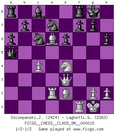 Last move : 1/2-1/2 2011 July 12 21:2:46 [Event "FICGS__CHESS__CLASS_SM__000015"] [Site "FICGS"] [Date "2011.07.03"] [Round "1"] [White "Szczepanski,Zbigniew"] [Black "Laghetti,Gaetano"] [Result "1/2-1/2"] [WhiteElo "2424"] [BlackElo "2363"] 1.e4 c5 2.Nf3 d6 3.d4 cxd4 4.Nxd4 Nf6 5.Nc3 a6 6.Bg5 e6 7.f4 Qb6 8.Qd2 Qxb2 9.Rb1 Qa3 10.e5 dxe5 11.fxe5 Nfd7 12.Ne4 Qxa2 13.Rd1 h6 14.Bh4 Qd5 15.Qe3 Qxe5 16.Be2 Bc5 17.Bg3 Qd5 18.c4 Bxd4 19.Rxd4 Qa5+ 20.Rd2 O-O 21.Bd6 Nc6 22.O-O 1/2-1/2 Sicilian : Najdorf, 7...Qb6 Kingside Castling by player Black (move 20) Kingside Castling by player White (move 22) This chess game ended in a draw. Follow this game move after move (download)The tactician must know what to do whenever something needs doing; the strategist must know what to do when nothing needs doing. (Savielly Tartakover) Was ist der Unterschied zwischen einem Strassenarbeiter und einem Schachspieler? --Der Schachspieler bewegt sich ab und zu. (Anonymous) Botvinnik trató de alejar el misterio referente al Ajedrez, siempre relacionandolo a situaciones de la vida diaria. Solía llamar al Ajedrez un problema inexacto típico, similar a aquellos en que la gente tiene siempre que resolver a cada día. (Garry Kasparov) Plusieurs personnes se sont demandées comment Tal faisait pour gagner... En fait, c'est très simple ! Il met ses pièces au centre de l'échiquier et les sacrifie quelque part ! (David Bronstein) Cactus - It is depressed cucumber. (Ilmars Cirulis)
