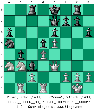 Last move : 1-0 2011 October 22 12:22:47 [Event "FICGS__CHESS__NO_ENGINES_TOURNAMENT__000044"] [Site "FICGS"] [Date "2011.07.04"] [Round "1"] [White "Pipac,Darko"] [Black "Satonnet,Patrick"] [Result "1-0"] [WhiteElo "1439"] [BlackElo "1490"] 1.e4 e6 2.d4 b6 3.a3 Bb7 4.Nc3 d5 5.e5 c5 6.Nf3 Ne7 7.Bg5 h6 8.Bxe7 Bxe7 9.Bb5+ Bc6 10.O-O Rg8 11.b4 cxb4 12.axb4 Bxb4 13.Bxc6+ Nxc6 14.Nb5 a6 15.Na3 Qe7 16.Qc1 Bc3 17.Rb1 b5 18.Rd1 b4 19.Qe3 Na5 20.Nd2 Rc8 21.Nb3 1-0 French defense Kingside Castling by player White (move 10) Player White won this chess game. Follow this game move after move (download)My style is somewhere between that of Tal and Petrosian. (Reshevsky) Ich hatte Zahnschmerzen im ersten Spiel. In der zweiten Partie tat mir der Kopf weh. In der dritten war es eine Rheuma-Attacke und während der vierten fühlte ich mich nicht gut. Und in der fünften? Nun, man muss doch nicht jedes Spiel gewinnen, oder? (Savielly Grigorievitsch Tartakower) Las combinaciones han sido siempre el aspecto más intrigante del Ajedrez. Los Maestros las buscan, el público las aplauden, los críticos las alaban. La razón se debe a que las combinaciones hacen posible que el Ajedrez sea más que un ejercicio matemático con una carencia de vida. Ellas son la poesía del juego, son del Ajedrez lo que la melodía es de la música. Ellas representan el triunfo de la mente sobre la materia. (Reuben Fine) Si je n'étais pas joueur d'échecs, je serais le meilleur dans quelque chose d'autre. (Anatoli Karpov) You can think I'm wrong, but that's no reason to quit thinking. (Gregory House, House M.D.)