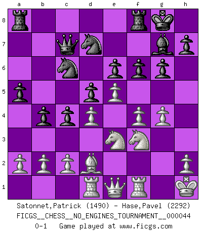 Last move : 0-1 2011 October 7 23:41:9 [Event "FICGS__CHESS__NO_ENGINES_TOURNAMENT__000044"] [Site "FICGS"] [Date "2011.07.04"] [Round "1"] [White "Satonnet,Patrick"] [Black "Hase,Pavel"] [Result "0-1"] [WhiteElo "1490"] [BlackElo "2292"] 1.e4 c5 2.f4 e6 3.Nf3 d5 4.Bb5+ Bd7 5.Bxd7+ Nxd7 6.d3 g6 7.O-O Bg7 8.Nc3 Ne7 9.Bd2 a6 10.g4 O-O 11.e5 b5 12.Qe1 b4 13.Nd1 a5 14.Ne3 Qc7 15.Kh1 c4 16.d4 f6 17.Rd1 Nc6 0-1 This chess game has been lost on time (started : 2011.07.04 0:20:17) Sicilian : Grand Prix attack Kingside Castling by player White (move 7) Kingside Castling by player Black (move 10) Player Black won this chess game. Follow this game move after move (download)The beauty of a move lies not in its' appearance but in the thought behind it. (Siegbert Tarrasch) Ich verstehe mehr vom Schach als irgendein anderer lebender Meister. (José Raúl Capablanca) El Ajedrez demanda una total concentración. (Bobby Fischer) Dieu déplace le joueur, et celui-ci la pièce. Quel Dieu derrière Dieu commence donc la trame ? Arturo Perez-Reverte (prix de littérature policière 1993). In every real man a child is hidden that wants to play. (Friedrich Nietzsche)