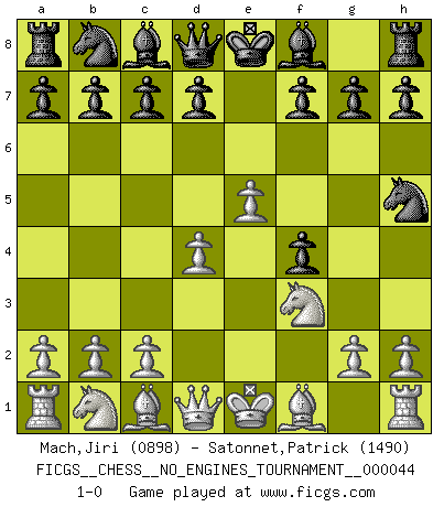 Last move : 1-0 2011 September 20 10:32:18 [Event "FICGS__CHESS__NO_ENGINES_TOURNAMENT__000044"] [Site "FICGS"] [Date "2011.07.04"] [Round "1"] [White "Mach,Jiri"] [Black "Satonnet,Patrick"] [Result "1-0"] [WhiteElo "0898"] [BlackElo "1490"] 1.e4 e5 2.f4 exf4 3.Nf3 Nf6 4.e5 Nh5 5.d4 1-0 This chess game has been lost on time (started : 2011.07.04 0:20:17) KGA : Schallop defense Player White won this chess game. Follow this game move after move (download)Chess is no whit inferior to the violin, and we have a large number of professional violinists. (Mikhail Botvinnik) Im Schach nämlich geht es darum, daß Ich des Gegners klein zu kriegen, sein Ego zu zerbrechen und zu zermahlen, seine Selbstachtung zu zertreten und zu verscharren und seine ganze mißachtenswerte sogenannte Persönlichkeit ein für alle Mal tot zu hacken und zu zerstampfen und dadurch die menschliche Gesellschaft von einer stinkenden Pestbeule zu befreien. Es ist ein königliches Spiel. (Robert James Fischer) La enorme capacidad mental, en la que sin ella no puede un jugador de Ajedrez existir, es demasiado requerida por el Ajedrez al grado de que nunca podrá liberar su mente de este juego. (Albert Einstein) Le thème de l'attaque double intervient d'une manière ou d'une autre dans l'immense majorité des combinaisons. (Youri Averbakh) A cynic is a man who knows the price of everything but the value of nothing. (Oscar Wilde)