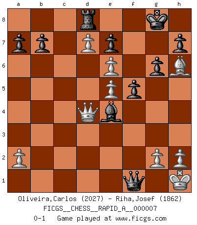 Last move : 0-1 2007 January 8 20:59:8 [Event "FICGS__CHESS__RAPID_A__000007"] [Site "FICGS"] [Date "2006.12.25"] [Round "1"] [White "Oliveira,Carlos"] [Black "Riha,Josef"] [Result "0-1"] [WhiteElo "2027"] [BlackElo "1862"] 1.d4 Nf6 2.c4 g6 3.Nc3 d5 4.cxd5 Nxd5 5.e4 Nxc3 6.bxc3 Bg7 7.Bc4 c5 8.Ne2 O-O 9.O-O Nc6 10.Be3 Bg4 11.f3 Na5 12.Bd3 cxd4 13.cxd4 Be6 14.d5 Bxa1 15.Qxa1 f6 16.Nd4 Bd7 17.Bh6 Re8 18.Kh1 Rc8 19.e5 Nc4 20.e6 Ba4 21.Be4 Nd6 22.Qb1 Nxe4 23.fxe4 Qb6 24.Qd3 Qa6 25.Qf3 Bc2 26.e5 Be4 27.Qf4 f5 28.d6 Rc4 29.d7 Rd8 30.Qe3 Rxd4 31.Qxd4 Qxf1+ 0-1 King's Indian defense, 3.Nc3 Kingside Castling by player Black (move 8) Kingside Castling by player White (move 9) Player Black won this chess game. Follow this game move after move (download)The beauty of a move lies not in its' appearance but in the thought behind it. (Siegbert Tarrasch) Die starken Figuren des Gegners muss man abtauschen. (José Raúl Capablanca) El jugador de combinación piensa hacia adelante; comienza de la posición dada y trabaja las movidas contundentes en su mente. (Emanuel Lasker) Les pièces de l'échiquier étaient impitoyables. Elles le retenaient, elles l'absorbaient. Il y avait de l'horreur en cela, mais aussi une harmonie unique. Car, qu'y a-t-il dans le monde, à part les échecs ? (V. Nabokov) Creativity is allowing yourself to make mistakes. Art is knowing which ones to keep. (Scott Adams)