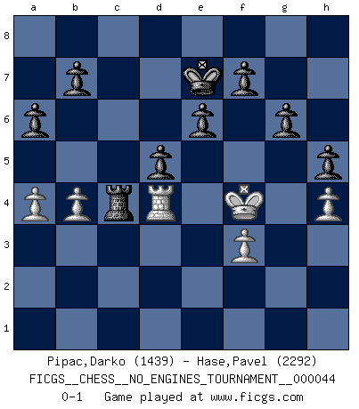 Last move : 0-1 2011 July 23 22:38:28 [Event "FICGS__CHESS__NO_ENGINES_TOURNAMENT__000044"] [Site "FICGS"] [Date "2011.07.04"] [Round "1"] [White "Pipac,Darko"] [Black "Hase,Pavel"] [Result "0-1"] [WhiteElo "1439"] [BlackElo "2292"] 1.e4 c5 2.Nf3 d6 3.Nc3 Nf6 4.Bb5+ Bd7 5.d4 cxd4 6.Nxd4 a6 7.Bxd7+ Nbxd7 8.O-O e6 9.Bg5 Be7 10.e5 Nxe5 11.h3 O-O 12.Re1 Qc7 13.a3 Qc4 14.Qd2 Nc6 15.Bxf6 Bxf6 16.Nxc6 Qxc6 17.Rad1 d5 18.g3 Rac8 19.Ne2 Qxc2 20.b4 Qxd2 21.Rxd2 Rc4 22.Rc1 Rfc8 23.Rxc4 Rxc4 24.h4 h5 25.Nf4 g6 26.Kg2 Bxh4 27.gxh4 Rxf4 28.Kg3 Rc4 29.f3 Rc3 30.a4 Kf8 31.Rd4 Ke7 32.Kf4 Rc4 0-1 Sicilian Kingside Castling by player White (move 8) Kingside Castling by player Black (move 11) Player Black won this chess game. Follow this game move after move (download)There's never before been a Chess player with such a thorough knowledge of the intricacies of the game and such an absolutely indomitable will to win. I think Bobby is the greatest player that ever lived. (Lisa Lane) Das ganze Leben mit einer Ehefrau ist wie ein Endspiel mit ungleichfarbigen Läufern. (Viktor Kortschnoi) Botvinnik trató de alejar el misterio referente al Ajedrez, siempre relacionandolo a situaciones de la vida diaria. Solía llamar al Ajedrez un problema inexacto típico, similar a aquellos en que la gente tiene siempre que resolver a cada día. (Garry Kasparov) Il (Jacob Murray) ne joue pas pour le bon coup, mais pour le meilleur. (Eloi Relange) Being number two sucks. (Andre Agassi)