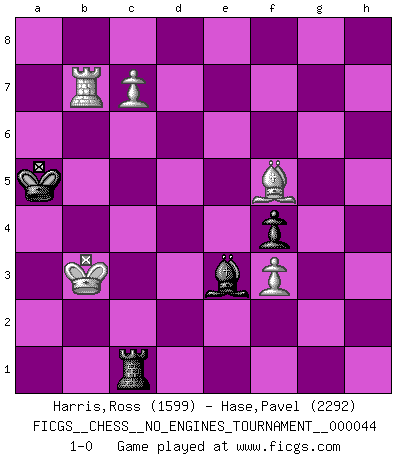 Last move : 1-0 2011 July 26 12:50:25 [Event "FICGS__CHESS__NO_ENGINES_TOURNAMENT__000044"] [Site "FICGS"] [Date "2011.07.04"] [Round "1"] [White "Harris,Ross"] [Black "Hase,Pavel"] [Result "1-0"] [WhiteElo "1599"] [BlackElo "2292"] 1.d4 Nf6 2.Bf4 c5 3.e3 Qb6 4.Qc1 cxd4 5.exd4 Qxd4 6.Nf3 Qb6 7.Nc3 e6 8.Be3 Qa5 9.Bd3 a6 10.O-O Bc5 11.Bg5 d5 12.Bxf6 gxf6 13.Qh6 Qd8 14.Qg7 Rf8 15.Bxh7 Nc6 16.Rad1 Bd7 17.a3 Qc7 18.Qxf6 Be7 19.Qg7 O-O-O 20.Ne2 Bd6 21.Ng3 Ne5 22.Qf6 Rh8 23.Bd3 Ng4 24.Qc3 Bc6 25.b4 d4 26.Nxd4 Rxh2 27.Nxc6 Rdh8 28.Ne7+ Bxe7 29.Qxc7+ Kxc7 30.Rfe1 Bd6 31.Kf1 Nf6 32.Ne4 Nxe4 33.Bxe4 Rh1+ 34.Ke2 Rxe1+ 35.Rxe1 a5 36.bxa5 Bxa3 37.Ra1 Bc5 38.a6 bxa6 39.Rxa6 Rc8 40.g4 Kd7 41.f3 Bd6 42.Kd3 Rc5 43.c4 f5 44.gxf5 exf5 45.Bd5 f4 46.Kd4 Ke7 47.Ra7+ Rc7 48.Ra5 Bb4 49.Rb5 Bd2 50.c5 Be3+ 51.Kc4 Ra7 52.c6 Kd6 53.Be4 Ra4+ 54.Kb3 Ra7 55.Rg5 Ra1 56.Rg6+ Kc7 57.Rg7+ Kb6 58.Rb7+ Ka6 59.Bd3+ Ka5 60.c7 Rc1 61.Bf5 1-0 Queen's pawn game Kingside Castling by player White (move 10) Queenside Castling by player Black (move 19) 10 pieces endgame at move 44 : White KRBPPP , Black KRBP WHITE : King + 1 Rook 1 Bishop 3 Pawns BLACK : King + 1 Rook 1 Bishop 1 Pawn 9 pieces endgame at move 44 : White KRBPP , Black KRBP WHITE : King + 1 Rook 1 Bishop 2 Pawns BLACK : King + 1 Rook 1 Bishop 1 Pawn Player White won this chess game. Follow this game move after move (download)We must make sure that Chess will not be like a dead language, very interesting, but for a very small group. (Sytze Faber) Je mehr wir mit Computern analysieren, desto mehr glauben wir an Verteidigung. (Vladimir Kramnik) Los problemas de Ajedrez exigen del compositor las mismas virtudes que caracterizan todo el arte de valor: originalidad, invención, concisión, armonía, complejidad e insinceridad explendida. (Vladimir Nabokov) Soyez une menace à chaque fois que vous vous asseyez pour jouer. (Ken Smith) Memory is a crazy woman that hoards colored rags and throws away food. (Austin O'Malley)