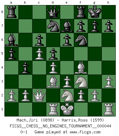 Last move : 0-1 2011 September 30 23:12:41 [Event "FICGS__CHESS__NO_ENGINES_TOURNAMENT__000044"] [Site "FICGS"] [Date "2011.07.04"] [Round "1"] [White "Mach,Jiri"] [Black "Harris,Ross"] [Result "0-1"] [WhiteElo "0898"] [BlackElo "1599"] 1.c4 Nf6 2.Nc3 e6 3.Nf3 d5 4.d4 Be7 5.Bf4 c6 6.e3 Nbd7 7.h3 O-O 8.Qc2 a6 9.Rd1 b5 10.c5 a5 11.Bd3 b4 12.Ne2 Ba6 0-1 This chess game has been lost on time (started : 2011.07.04 0:20:17) English Opening Kingside Castling by player Black (move 7) Player Black won this chess game. Follow this game move after move (download)The way he plays Chess demonstrates a man's whole nature. (Stanley Ellin) Man braucht nicht immer den besten Zug zu spielen: Ein Zug muß aktiv, unternehmungslustig, korrekt und schön sein. (David Bronstein) El Ajedrez, como la música, como el amor, tiene el poder de hacer feliz a la gente. (Siegbert Tarrasch) Les échecs sont un jeu terrible. Si vous n'avez pas le centre, votre adversaire a une position plus libre. Par contre, si vous avez le centre, alors vous avez vraiment quelque chose pour laquelle vous inquiéter ! (Siegbert Tarrasch) Without enthusiasm, virtue functions not at all, and vice only poorly. (Mignon McLaughlin, The Neurotic's Notebook, 1960)