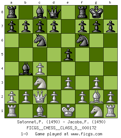 Last move : 1-0 2011 August 23 14:18:1 [Event "FICGS__CHESS__CLASS_D__000172"] [Site "FICGS"] [Date "2011.07.04"] [Round "1"] [White "Satonnet,Patrick"] [Black "Jacobs,Francois"] [Result "1-0"] [WhiteElo "1490"] [BlackElo "1490"] 1.c4 e5 2.Nc3 Nf6 3.g3 Bb4 4.Qc2 Nc6 5.e3 O-O 6.Bg2 1-0 English : Bremen, Smyslov system Kingside Castling by player Black (move 5) Player White won this chess game. Follow this game move after move (download)Human affairs are like a Chess game: only those who do not take it seriously can be called good players. (Hung Tzu Ch'eng) Es hat in meinem Leben Zeiten gegeben, in denen das Schachspiel, wenn nicht zum Lebenszweck, so doch zu einem regelrechten Lebensersatz geworden ist. Man fühlt sich in solchen Zeiten nicht so, als besäße man eine göttliche Gabe, sondern eher so, als sei man von ihr besessen. (Garry Kasparov) El tablero es el mundo, las piezas es el fenomeno del universo, las reglas del juego son lo que llamamos leyes de la naturaleza y el jugador del lado opuesto, se encuentra oculto a nuestra vista. (Thomas Huxley) Dieu déplace le joueur, et celui-ci la pièce. Quel Dieu derrière Dieu commence donc la trame ? Arturo Perez-Reverte (prix de littérature policière 1993). The best weapon against an enemy is another enemy. (Friedrich Nietzsche)