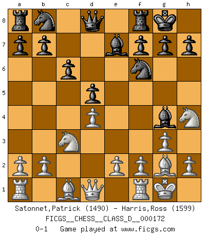 Last move : 0-1 2011 August 26 22:3:15 [Event "FICGS__CHESS__CLASS_D__000172"] [Site "FICGS"] [Date "2011.07.04"] [Round "1"] [White "Satonnet,Patrick"] [Black "Harris,Ross"] [Result "0-1"] [WhiteElo "1490"] [BlackElo "1599"] 1.c4 Nf6 2.Nc3 e6 3.g3 d5 4.cxd5 exd5 5.Bg2 c6 6.d4 Be7 7.Nf3 O-O 8.O-O Bf5 9.Nh4 Bg4 0-1 This chess game has been lost on time (started : 2011.07.04 7:51:59) English Opening Kingside Castling by player Black (move 7) Kingside Castling by player White (move 8) Player Black won this chess game. Follow this game move after move (download)It's just you and your opponent at the board and you're trying to prove something. (Bobby Fischer) Ich glaube nicht an Psychologie, ich glaube an gute Züge. (Robert James Fischer) Bobby es la celebridad menos entendida y malinterpretada que camina el la faz de esta tierra. (Yasser Seirawan) La solitude du joueur d'Echecs à l'approche du mat est semblable à celle du condamné. (Francis Szpiner) All men can see these tactics whereby I conquer, but what none can see is the strategy out of which victory is evolved. (Sun Tzu)