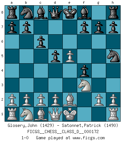 Last move : 1-0 2011 August 27 10:2:20 [Event "FICGS__CHESS__CLASS_D__000172"] [Site "FICGS"] [Date "2011.07.04"] [Round "1"] [White "Glosery,John"] [Black "Satonnet,Patrick"] [Result "1-0"] [WhiteElo "1429"] [BlackElo "1490"] 1.e4 e5 2.f4 exf4 3.Nf3 Nf6 4.e5 Nh5 5.Bc4 d5 6.Bb5+ c6 7.Be2 1-0 This chess game has been lost on time (started : 2011.07.04 7:51:59) KGA : Schallop defense Player White won this chess game. Follow this game move after move (download)Chess is a terrible game. If you have no center, your opponent has a freer position. If you do have a center, then you really have something to worry about ! (Siegbert Tarrasch) Modernes Schach erfordert enorme Anspannung. Es ist für einen normalen Menschen unmöglich das auszuhalten. (Viktor Kortschnoi) Nos gusta pensar. (Gary Kasparov) Les échecs c'est le défi de l'alpiniste, toujours plus haut, prêt à tout pour monter à l'assaut du Roi ennemi. Les échecs, c'est de la musique en mouvement, un ballet majestueux pour les yeux. C'est de la poésie composée par les fantômes du passé qui au même titre que Rimbaud ou Verlaine méritent notre admiration. Les échecs, c'est de la peinture ou le moindre mouvement modifie le tableau pour en faire un Picasso ou un Van Gogh. Les échecs, c'est tout et rien, c'est la vie et la mort. Jjulie33 sur le forum de France-Echecs. Political correctness is subjecting us to gross incompetence. (Johann Piek)