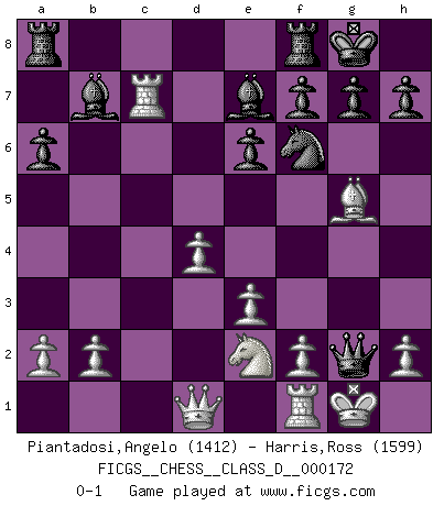 Last move : 0-1 2011 July 18 19:59:13 [Event "FICGS__CHESS__CLASS_D__000172"] [Site "FICGS"] [Date "2011.07.04"] [Round "1"] [White "Piantadosi,Angelo"] [Black "Harris,Ross"] [Result "0-1"] [WhiteElo "1412"] [BlackElo "1599"] 1.c4 Nf6 2.Nc3 e6 3.d4 d5 4.Bg5 Nbd7 5.e3 Be7 6.Nf3 O-O 7.Rc1 a6 8.Bd3 dxc4 9.Bxc4 b5 10.O-O bxc4 11.Ne2 Nb6 12.Ne5 Bb7 13.Nxc4 Nxc4 14.Rxc4 Qd5 15.Rxc7 Qxg2+ 0-1 English Opening Kingside Castling by player Black (move 6) Kingside Castling by player White (move 10) Player Black won this chess game. Follow this game move after move (download)The isolated Pawn casts gloom over the entire chessboard. (Aaron Nimzovich) Spielt Blackmar-Diemer-Gambit, und das Matt kommt von selbst! (Emil Joseph Diemer) No hay otro maestro que tenga una voluntad terrífica de ganar. Al tablero, el irradía peligro y aún los oponentes mas fuertes tienden a congelarse como liebres cuando olfatean a una pantera. Aún sus debilidades son peligrosas. Con las blancas, su juego de apertura es predecible - te es posible hacer planes en su contra - pero es tan fuerte que tus planes casi nunca funcionan. En el juego medio, su precisión e invención son fabulosas y en finales, tú simplemente no le puedes vencer. (Experto Alemán anónimo) Il n'y a pas eu de défaite parce que je ne crois pas que cet ordinateur ait jamais existé. IBM a triché en refusant d'imprimer les modes de recherche de la machine. C'est évident, pendant le match, des coups décisifs ont été joués par des êtres humains. Aujourd'hui, les meilleurs spécialistes en informatique ne peuvent toujours pas expliquer comment Deep-Blue a pu jouer contre la logique des ordinateurs. IBM a gagné une guerre de communication, mais ils sont incapables de prouver que l'ordinateur a gagné tout seul. (Garry Kasparov) The Movers & Shakers of this world are those who play chess in the mornings and go to the disco in the evenings. (Dinesh De Silva)