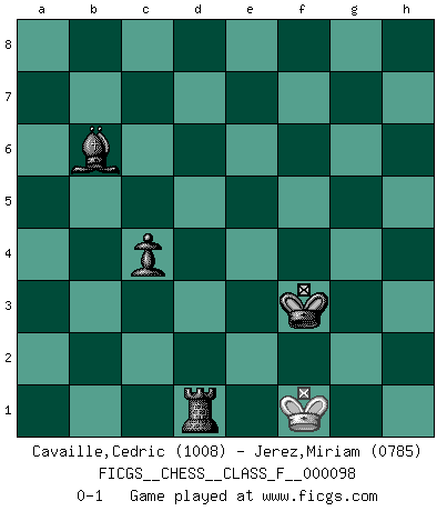 Last move : 0-1 2011 November 20 3:59:52 [Event "FICGS__CHESS__CLASS_F__000098"] [Site "FICGS"] [Date "2011.07.04"] [Round "1"] [White "Cavaille,Cedric"] [Black "Jerez,Miriam"] [Result "0-1"] [WhiteElo "1008"] [BlackElo "0785"] 1.e4 e5 2.Nf3 Nc6 3.Bc4 Nf6 4.Ng5 d5 5.exd5 Nd4 6.c3 Nf5 7.a3 h6 8.Nf3 Nxd5 9.d4 exd4 10.Nxd4 Nxd4 11.cxd4 Be7 12.O-O O-O 13.Nc3 Nxc3 14.bxc3 c6 15.Bb2 b5 16.Ba2 a5 17.a4 b4 18.cxb4 axb4 19.Bb3 Bf6 20.Qd3 Ba6 21.Bc4 Bxc4 22.Qxc4 Qd6 23.a5 Rfd8 24.Bc3 bxc3 25.Qxc3 Bxd4 26.Rfd1 Bxc3 27.Rxd6 Rxd6 28.Rc1 Bxa5 29.g4 Rc8 30.Kg2 c5 31.Kg3 g5 32.h4 f6 33.hxg5 hxg5 34.f4 gxf4+ 35.Kxf4 Rd4+ 36.Kf5 Kf7 37.g5 fxg5 38.Kxg5 c4 39.Rf1+ Kg7 40.Rf6 Rc5+ 41.Rf5 Rxf5+ 42.Kxf5 Kf7 43.Ke5 Rd1 44.Ke4 Ke6 45.Kf4 Rd5 46.Ke3 Ke5 47.Kf3 Kf5 48.Ke3 Bb6+ 49.Kf3 Rd3+ 50.Ke2 Ke4 51.Ke1 Kf3 52.Kf1 Rd1+ 0-1 Two knights defense : Fritz variation Kingside Castling by player White (move 12) Kingside Castling by player Black (move 12) 10 pieces endgame at move 34 : White KRP , Black KRRBPPP WHITE : King + 1 Rook 1 Pawn BLACK : King + 2 Rooks 1 Bishop 3 Pawns 9 pieces endgame at move 35 : White KRP , Black KRRBPP WHITE : King + 1 Rook 1 Pawn BLACK : King + 2 Rooks 1 Bishop 2 Pawns 8 pieces endgame at move 37 : White KR , Black KRRBPP WHITE : King + 1 Rook BLACK : King + 2 Rooks 1 Bishop 2 Pawns 7 pieces endgame at move 38 : White KR , Black KRRBP WHITE : King + 1 Rook BLACK : King + 2 Rooks 1 Bishop 1 Pawn 6 pieces endgame at move 41 : White K , Black KRRBP WHITE : King + BLACK : King + 2 Rooks 1 Bishop 1 Pawn 5 pieces endgame at move 42 : White K , Black KRBP WHITE : King + BLACK : King + 1 Rook 1 Bishop 1 Pawn Player Black won this chess game. Follow this game move after move (download)It is not a move, even the best move that you must seek, but a realizable plan. (Eugene Znosko-Borovsky) Ich habe Kasparov in Rente geschickt. (Veselin Topalov) Dios mío, Bobby Fischer juega tan simple. (Alexei Suetin) Avant la finale, les dieux ont créé le milieu de partie. (Tarrasch) Heh, heh, heh. Time to abandon ship. (General Grievous in Star Wars ep.3)