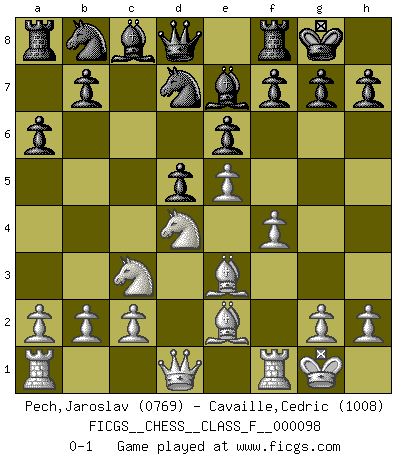 Last move : 0-1 2011 October 3 23:21:16 [Event "FICGS__CHESS__CLASS_F__000098"] [Site "FICGS"] [Date "2011.07.04"] [Round "1"] [White "Pech,Jaroslav"] [Black "Cavaille,Cedric"] [Result "0-1"] [WhiteElo "0769"] [BlackElo "1008"] 1.e4 c5 2.Nf3 d6 3.d4 cxd4 4.Nxd4 Nf6 5.Nc3 e6 6.Be2 Be7 7.O-O O-O 8.f4 d5 9.e5 Nfd7 10.Be3 a6 0-1 This chess game has been lost on time (started : 2011.07.04 13:23:22) Sicilian : Scheveningen, 6.Be2 Kingside Castling by player White (move 7) Kingside Castling by player Black (move 7) Player Black won this chess game. Follow this game move after move (download)Different people feel differently about resigning. (Bobby Fischer) Das Zentrum ist der Balkan des Schachbretts - Kriegshandlungen können in jedem Moment ausbrechen. (Aaron Nimzowitsch) El hombre es un frívolo, una creatura engañosa y como un jugador de Ajedrez, se preocupa mas por el proceso de obtener su meta que de la meta por sí misma. (Dostoyevsky) Des idées, des idées, j'en ai cent, j'en ai mille. Des bonnes, des mauvaises, applicables, irréalisables... Il suffit de faire le tri ! (Roos) For to win one hundred victories in one hundred battles is not the acme of skill. To subdue the enemy without fighting is the acme of skill. (Sun Tzu)