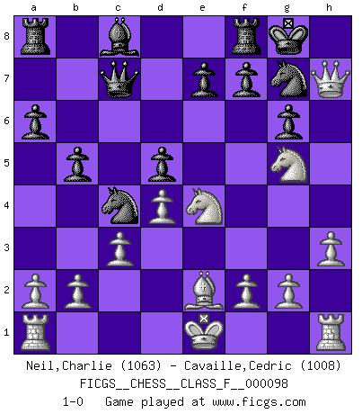 Last move : 1-0 2011 August 3 12:23:32 [Event "FICGS__CHESS__CLASS_F__000098"] [Site "FICGS"] [Date "2011.07.04"] [Round "1"] [White "Neil,Charlie"] [Black "Cavaille,Cedric"] [Result "1-0"] [WhiteElo "1063"] [BlackElo "1008"] 1.Nf3 g6 2.d4 Bg7 3.c3 Nf6 4.Bf4 d6 5.h3 c6 6.Nbd2 O-O 7.e3 c5 8.Bc4 a6 9.Nb3 b5 10.Be2 cxd4 11.exd4 Nh5 12.Be3 Nc6 13.Qc1 Na5 14.Nbd2 Qc7 15.Ne4 Nc4 16.Bg5 h6 17.Bxh6 Bxh6 18.Qxh6 Ng7 19.Nfg5 d5 20.Qh7+ 1-0 Reti Opening Kingside Castling by player Black (move 6) Player White won this chess game. Follow this game move after move (download)Castle early and often. (Rob Sillars) Je mehr wir mit Computern analysieren, desto mehr glauben wir an Verteidigung. (Vladimir Kramnik) Bobby Fischer es el mas grande genio de Ajedrez de todos los tiempos. (Alexander Kotov) C'est la seule position que je connaisse où les deux camps sont mals. Propos prêtés à V. Anand. I would love to change the world, but they won't give me the source code. (Unknown)