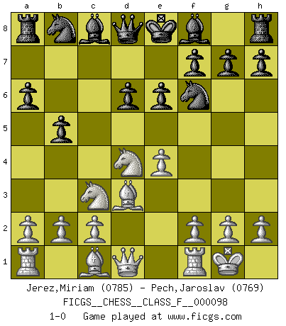 Last move : 1-0 2011 September 1 10:12:42 [Event "FICGS__CHESS__CLASS_F__000098"] [Site "FICGS"] [Date "2011.07.04"] [Round "1"] [White "Jerez,Miriam"] [Black "Pech,Jaroslav"] [Result "1-0"] [WhiteElo "0785"] [BlackElo "0769"] 1.e4 d6 2.Nf3 Nf6 3.Nc3 c5 4.d4 cxd4 5.Nxd4 a6 6.Bc4 e6 7.O-O b5 8.Bd3 1-0 This chess game has been lost on time (started : 2011.07.04 13:23:22) King's pawn Opening Kingside Castling by player White (move 7) Player White won this chess game. Follow this game move after move (download)Even the laziest King flees wildly in the face of a double check ! (Aaron Nimzowitsch) Je älter ich werde, um so mehr schätze ich die Bauern. (Paul Keres) Un buen jugador siempre tiene buena suerte. (José Raúl Capablanca) Les sacrifices démontrent seulement que quelqu'un a gaffé. (Savielly Tartacover) You can't play chess if you're groggy from pills. (Anatoly Karpov)