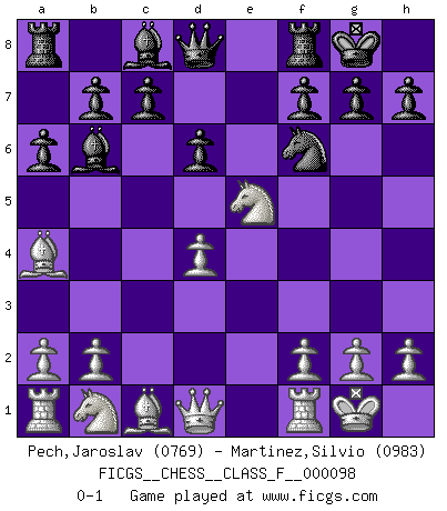 Last move : 0-1 2011 October 5 0:28:36 [Event "FICGS__CHESS__CLASS_F__000098"] [Site "FICGS"] [Date "2011.07.04"] [Round "1"] [White "Pech,Jaroslav"] [Black "Martinez,Silvio"] [Result "0-1"] [WhiteElo "0769"] [BlackElo "0983"] 1.e4 e5 2.Nf3 Nc6 3.Bb5 Nf6 4.O-O a6 5.Ba4 Bc5 6.c3 O-O 7.d4 exd4 8.e5 Nxe5 9.Nxe5 d6 10.cxd4 Bb6 0-1 Ruy Lopez : Berlin defense, 4.O-O Kingside Castling by player White (move 4) Kingside Castling by player Black (move 6) Player Black won this chess game. Follow this game move after move (download)Chess is a matter of delicate judgment, knowing when to punch and how to duck. (Bobby Fischer) Ich verlor meine Bürgerrechte, mein Gehalt wurde mir nicht mehr bezahlt und ich wurde zensiert und durfte nicht mehr ins Ausland reisen. [nach dem Match Fischer-Taimanov 6:0] (Mark Taimanov) Observen a Garry Kasparov. Después de una derrota, invariablemente el gana la próxima partida. Prácticamente hace pedazos a su siguiente oponente. Eso es algo que tenemos que aprender a lograr. (Maurice Ashley) Le jeu d'échecs fait naître et fortifie en nous plusieurs qualités précieuses dans le cours de l'existence, telles que la prévoyance, la circonspection, la prudence, et la persévérance. (Benjamin Franklin - 1783, la morale des échecs) You have to believe in yourself. (Sun Tzu)