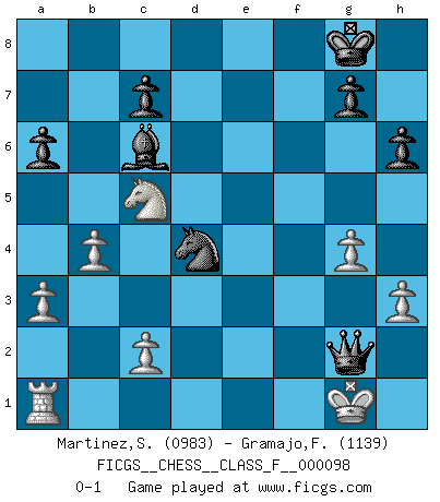 Last move : 0-1 2011 September 2 3:33:23 [Event "FICGS__CHESS__CLASS_F__000098"] [Site "FICGS"] [Date "2011.07.04"] [Round "1"] [White "Martinez,Silvio"] [Black "Gramajo,Francisco"] [Result "0-1"] [WhiteElo "0983"] [BlackElo "1139"] 1.e4 e5 2.Nf3 Nc6 3.Nc3 Bb4 4.Bc4 h6 5.O-O Nf6 6.d4 d6 7.dxe5 dxe5 8.Bd2 O-O 9.a3 Bc5 10.b4 Bd4 11.Nxd4 exd4 12.Na4 Nxe4 13.h3 a6 14.Re1 Bf5 15.g4 Bg6 16.Bd3 Re8 17.Re2 f5 18.Bxe4 fxe4 19.Nc5 e3 20.fxe3 Qh4 21.exd4 Rxe2 22.Qxe2 Re8 23.Qxe8+ Bxe8 24.Kh2 Qf2+ 25.Kh1 Qxd2 26.Nxb7 Nxd4 27.Nc5 Bc6+ 28.Kg1 Qg2+ 0-1 Three knights game Kingside Castling by player White (move 5) Kingside Castling by player Black (move 8) Player Black won this chess game. Follow this game move after move (download)Chess is the art which expresses the science of logic. (Mikhail Botvinnik) Im Leben werden Partien nie so unstrittig gewonnen wie im Spiel (Emanuel Lasker) A través de las casillas del tablero, los Indios explican el movimiento del tiempo y la edad, las influencias mas altas que controlan el mundo y los lazos que vinculan al Ajedrez con el alma humana. (Al-Masudi) J'ai vu le vaincu d'Echecs jouer des années durant dans l'espoir de la fête de la victoire. Car tu es plus riche de ce qu'elle existe si même elle n'est point pour toi. Ainsi de la perle du fond des mers. (Antoine de Saint-Exupéry) Those parts of the system that you can hit with a hammer (not advised) are called hardware; those program instructions that you can only curse at are called software. (Anonymous)