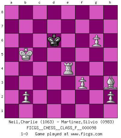 Last move : 1-0 2012 January 5 1:26:52 [Event "FICGS__CHESS__CLASS_F__000098"] [Site "FICGS"] [Date "2011.07.04"] [Round "1"] [White "Neil,Charlie"] [Black "Martinez,Silvio"] [Result "1-0"] [WhiteElo "1063"] [BlackElo "0983"] 1.d4 d5 2.c4 dxc4 3.e4 f6 4.Bxc4 e5 5.Nf3 c6 6.O-O Ne7 7.dxe5 Qxd1 8.Rxd1 Nd7 9.exf6 gxf6 10.Nc3 b5 11.Bd3 Nc5 12.Bc2 Bg7 13.Bf4 Bg4 14.Rd6 Rg8 15.Nd4 h5 16.f3 Bd7 17.Rd1 Bh8 18.Nf5 Nxf5 19.exf5 Rd8 20.Be3 Nb7 21.R6d2 a5 22.Bb6 Rc8 23.Rxd7 Rg7 24.Rxg7 Bxg7 25.Re1+ Kf7 26.Bb3+ Kf8 27.Be6 Rb8 28.Ne4 a4 29.a3 Bh6 30.Nxf6 Nd6 31.Bc5 Kg7 32.Nxh5+ Kh8 33.Bxd6 Rd8 34.Be5+ Kh7 35.Nf6+ Kg7 36.Ng4 Kh7 37.Nxh6 Kxh6 38.f6 c5 39.f7 Kg6 40.Bd6 Kg7 41.f8Q+ Rxf8 42.Bxf8+ Kxf8 43.Re5 Ke7 44.Bh3 Kd6 45.Rh5 Kc6 46.Kf2 Kd6 47.Ke3 Kc6 48.Rf5 Kd6 49.g4 b4 50.axb4 cxb4 51.Kd2 Ke6 52.Kc2 b3 53.Kc3 Kd6 54.Ra5 Kc6 55.Rxa4 Kb5 56.Kxb3 Kc5 57.Re4 Kd5 58.Kb4 Kd6 59.Kb5 Kd5 60.g5 Kd6 61.g6 1-0 QGA : 3.e4 Kingside Castling by player White (move 6) Promotion Queen by player White (move 41) 10 pieces endgame at move 50 : White KRBPPPP , Black KPP WHITE : King + 1 Rook 1 Bishop 4 Pawns BLACK : King + 2 Pawns 9 pieces endgame at move 55 : White KRBPPPP , Black KP WHITE : King + 1 Rook 1 Bishop 4 Pawns BLACK : King + 1 Pawn 8 pieces endgame at move 56 : White KRBPPPP , Black K WHITE : King + 1 Rook 1 Bishop 4 Pawns BLACK : King + Player White won this chess game. Follow this game move after move (download)What would Chess be without silly mistakes ? (Kurt Richter) Ich würde die 30 stärksten Spieler der USA im Simultanspiel besiegen. (José Raúl Capablanca) Los libros de Ajedrez deben de usarse igual como usamos los anteojos: para mejorar la vista, aunque algunos jugadores los quieren usar como si ellos les otorgaran la vision. (José Raúl Capablanca) A ce moment-là, je menaçais de comprendre la position ! (Clément L'Heureux) A government big enough to give you everything you want is strong enough to take everything you have. (Thomas Jefferson)
