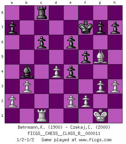 Last move : 1/2-1/2 2007 March 6 13:4:27 [Event "FICGS__CHESS__CLASS_B__000011"] [Site "FICGS"] [Date "2006.12.26"] [Round "1"] [White "Behrmann,Klaus"] [Black "Czekaj,Christophe"] [Result "1/2-1/2"] [WhiteElo "1900"] [BlackElo "2000"] 1.Nf3 d5 2.g3 Bg4 3.Bg2 Nd7 4.O-O e6 5.d4 c6 6.Nbd2 Ngf6 7.h3 Bxf3 8.Nxf3 Bd6 9.Qd3 Ne4 10.c4 O-O 11.Qb3 b6 12.Nd2 Ndf6 13.Rd1 Nxd2 14.Bxd2 Ne4 15.Bxe4 dxe4 16.Qc2 f5 17.c5 Be7 18.cxb6 Qxb6 19.Be3 Qb5 20.Rac1 Rac8 21.Qc4 Kf7 22.Rd2 Rfd8 23.Rdc2 Rb8 24.b3 Ba3 25.Rd1 Rbc8 26.Bg5 Rd5 27.Qxb5 Rxb5 28.Rc4 Rb4 29.Rxb4 Bxb4 30.Rc1 1/2-1/2 Reti : King's Indian attack, Keres variation Kingside Castling by player White (move 4) Kingside Castling by player Black (move 10) This chess game ended in a draw. Follow this game move after move (download)The Chess pieces are the block alphabet which shapes thoughts; and these thoughts, although making a visual design on the chessboard, express their beauty abstractly, like a poem. (Marcel Duchamp) Aljechin war kein Nazi. Er war ein Opportunist. Ein schrecklicher Mann. Er liebte Geld über alles und würde für Geld ein Jude, ein Katolik oder ein Protestant werden. (Miguel Najdorf) El Ajedrez es 99 por ciento táctica. (Teichmann) Pour se monter efficace, un Cavalier a besoin d'avant-postes ! Les Cavaliers font les meilleurs bloqueurs de pions passés. A good player is always lucky. (Capablanca)