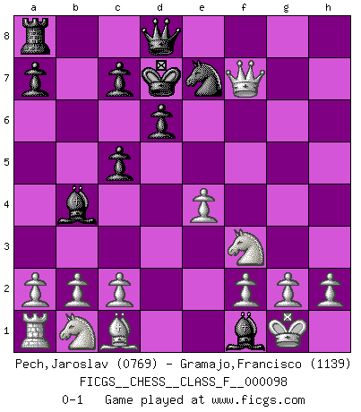 Last move : 0-1 2011 September 26 10:56:6 [Event "FICGS__CHESS__CLASS_F__000098"] [Site "FICGS"] [Date "2011.07.04"] [Round "1"] [White "Pech,Jaroslav"] [Black "Gramajo,Francisco"] [Result "0-1"] [WhiteElo "0769"] [BlackElo "1139"] 1.e4 e5 2.Nf3 Nc6 3.Bb5 Bb4 4.O-O d6 5.d4 exd4 6.Bxc6+ bxc6 7.Qxd4 c5 8.Qxg7 Ba6 9.Qxh8 Kd7 10.Qxh7 Bxf1 11.Qxf7+ Ne7 0-1 This chess game has been lost on time (started : 2011.07.04 13:23:22) Ruy Lopez (Spanish Opening) Kingside Castling by player White (move 4) Player Black won this chess game. Follow this game move after move (download)My style is somewhere between that of Tal and Petrosian. (Reshevsky) Moralische Siege zählen nicht. (Savielly Grigorievitsch Tartakower) El ganador de una partida es aquel jugador que hace el penúltimo error. (Savielly Tartakover) Les ravages du H expliquent la différence de niveau entre Tal et Thal [Abergel]. Art is not a thing, it is a way. (Elbert Hubbard)