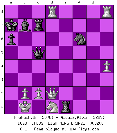 Last move : 0-1 2011 July 4 20:51:33 [Event "FICGS__CHESS__LIGHTNING_BRONZE__000206"] [Site "FICGS"] [Date "2011.07.04"] [Round "1"] [White "Prakash,Om"] [Black "Alcala,Alvin"] [Result "0-1"] [WhiteElo "2078"] [BlackElo "2289"] 1.e4 c5 2.Nf3 d6 3.d4 cxd4 4.Nxd4 Nf6 5.Nc3 a6 6.Bg5 Nbd7 7.f4 e6 8.Qf3 Qc7 9.O-O-O b5 10.Bd3 Bb7 11.a3 Be7 12.Kb1 h6 13.Qh3 Nc5 14.Rhe1 O-O-O 15.Bh4 g5 16.Bf2 gxf4 17.g3 fxg3 18.Bxg3 Rhg8 19.Qf1 Qb6 20.e5 dxe5 21.Bxe5 Ncd7 22.Nf5 exf5 23.Bxf5 Rg5 24.Bg3 Bc5 25.Qf4 Bc6 26.Bh4 b4 27.axb4 Bxb4 28.Rd3 Kb7 29.Bxd7 Bxd7 30.Qf3+ Ka7 31.Bf2 Bc5 32.Bxc5 Rxc5 33.Re7 Qc6 34.Qd1 Kb8 35.Rxf7 Re5 36.Qd2 Re6 37.Qxh6 Rc8 38.Qh4 Rc7 39.Rd4 Kb7 40.Rf8 Be8 41.Qf2 Qb6 42.Qd2 Qc5 43.Rh8 Ka7 44.Rd8 Bc6 45.Nd1 Bb7 46.h4 Re1 0-1 Sicilian : Najdorf, 6.Bg5 Queenside Castling by player White (move 9) Queenside Castling by player Black (move 14) Player Black won this chess game. Follow this game move after move (download)All Chess players should have a hobby. (Savielly Tartakower) Schach verlangt totale Konzentration. (Robert James Fischer) Tu sabes que vas a perder. Aún cuando tenía la ventaja, yo sabía que iba a perder. - al estar jugando con Fischer (Andrew Soltis) Celui qui prend des risques peut perdre, celui qui n'en prend pas perd toujours. (Xavier Tartacover) Beta. Software undergoes beta testing shortly before it's released. Beta is latin for still doesn't work. (Anonymous)