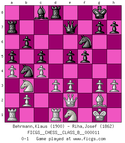 Last move : 0-1 2007 January 8 15:42:0 [Event "FICGS__CHESS__CLASS_B__000011"] [Site "FICGS"] [Date "2006.12.26"] [Round "1"] [White "Behrmann,Klaus"] [Black "Riha,Josef"] [Result "0-1"] [WhiteElo "1900"] [BlackElo "1862"] 1.Nf3 d5 2.g3 Nf6 3.Bg2 c5 4.O-O Nc6 5.d3 e5 6.c4 d4 7.Nbd2 Be7 8.Nb3 O-O 9.Re1 a5 10.Bg5 Ng4 11.Bxe7 Qxe7 12.a4 f5 13.e3 dxe3 14.fxe3 Rd8 15.Qe2 Nb4 16.Red1 Ra7 17.h3 Nf6 18.Ne1 b6 0-1 Reti : King's Indian attack (Barcza system) Kingside Castling by player White (move 4) Kingside Castling by player Black (move 8) Player Black won this chess game. Follow this game move after move (download)During a Chess competition a Chessmaster should be a combination of a beast of prey and a monk. (Alexander Alekhine) Ich verachte Kasparow. (Viktor Kortschnoi) El Ajedrez es una guerra en un tablero. El objetivo es aplastar la mente del oponente. (Bobby Fischer) Donnez-moi un Cavalier en 6e et je gagnerais toutes mes parties. (Steinitz) He who defends everything defends nothing. (Frederick the Great)