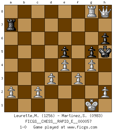 Last move : 1-0 2011 October 24 1:24:19 [Event "FICGS__CHESS__RAPID_E__000057"] [Site "FICGS"] [Date "2011.07.05"] [Round "1"] [White "Leurette,Marc-Antoine"] [Black "Martinez,Silvio"] [Result "1-0"] [WhiteElo "1256"] [BlackElo "0983"] 1.e4 e5 2.Nf3 Nc6 3.Bc4 Nf6 4.Ng5 Be7 5.Nxf7 O-O 6.Nxd8 Kh8 7.Nxc6 dxc6 8.Nc3 b5 9.Bd3 c5 10.Bxb5 a6 11.Bc6 Rb8 12.d3 h6 13.Be3 Rxb2 14.Na4 Rb8 15.Bxc5 Bxc5 16.Nxc5 Rb6 17.Ba4 Bg4 18.f3 Bh5 19.Rb1 Rxb1 20.Qxb1 a5 21.Nd7 Nxd7 22.Bxd7 Rf7 23.Qb8+ Kh7 24.Qxc7 Kg8 25.Qc8+ Rf8 26.Be6+ Bf7 27.Bxf7+ Kxf7 28.Qc7+ Kg8 29.O-O a4 30.Qc4+ Rf7 31.Qxa4 Rf8 32.Rb1 g5 33.Qc4+ Rf7 34.Rb8+ Kg7 35.Qc8 Ra7 36.Qg8+ Kf6 37.Qh8+ Kg6 38.Rg8+ Kh5 39.g4+ 1-0 Two knights defense Kingside Castling by player Black (move 5) Kingside Castling by player White (move 29) Player White won this chess game. Follow this game move after move (download)A man that will take back a move at Chess will pick a pocket. (Richard Fenton) Heutzutage gewinnt im Turnier nicht derjenige Spieler, der weitreichende Pläne entwirft, sondern einfach jener, der Zug um Zug kämpft. (David Bronstein) La última cosa en que Fischer estaba interesado era en tonterías, siempre y cuando el Ajedrez estuviera involucrado. (Elie Agur) Vous m'avez demandé de vous exposer quel est le fondement de la prière. Je ne fais que préparer les pièces du jeu sur la table... Nous sera-t-il permis d'en adopter les règles et si nous les appliquons scrupuleusement nous ne tarderons pas à faire mat le Roi divin ! Il ne pourra échapper à nos mains. (Sainte Thérèse d'Avila, Chemin de perfection) History is the quarrels of popes and kings, with wars or pestilences in every page; the men all so good for nothing, and hardly any women at all. (Jane Austen)