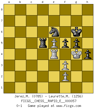 Last move : 0-1 2011 November 17 1:0:50 [Event "FICGS__CHESS__RAPID_E__000057"] [Site "FICGS"] [Date "2011.07.05"] [Round "1"] [White "Jerez,Miriam"] [Black "Leurette,Marc-Antoine"] [Result "0-1"] [WhiteElo "0785"] [BlackElo "1256"] 1.e4 e5 2.Nf3 Nc6 3.Nc3 Nf6 4.Bc4 Bc5 5.O-O O-O 6.d4 Bd6 7.d5 Na5 8.Bd3 c6 9.dxc6 dxc6 10.a3 b5 11.h3 Nb7 12.b4 c5 13.bxc5 Bxc5 14.Nxe5 Bd4 15.Nc6 Qb6 16.Nxd4 Qxd4 17.Bb2 Qc5 18.Nxb5 a6 19.Nd4 Bd7 20.Re1 Rfe8 21.a4 a5 22.c4 Bc6 23.Nxc6 Qxc6 24.Qf3 Nc5 25.e5 Qxf3 26.gxf3 Nxd3 27.Re2 Nf4 28.Re3 N6h5 29.h4 Ne6 30.Rd1 Red8 31.Rxd8+ Rxd8 32.Bc3 Rc8 33.Bxa5 Rxc4 34.Ra3 Rxh4 35.Bc3 Nhf4 36.a5 Ne2+ 37.Kf1 Nxc3 38.Rxc3 Ra4 39.Re3 Rxa5 40.Kg2 g5 41.Kg3 h5 42.Re4 Rd5 43.Re3 Kg7 44.Re4 h4+ 45.Kh3 Kg6 46.Kg4 f5+ 0-1 Four knights : Italian variation Kingside Castling by player White (move 5) Kingside Castling by player Black (move 5) Player Black won this chess game. Follow this game move after move (download)Chess is the art of analysis. (Mikhail Botvinnik) Jeder Fehler erscheint unglaublich dumm, wenn andre ihn begehen. (Georg Christoph Lichtenberg) El Ajedrez es el arte del análisis. (Mikhail Botvinnik) La guerre est enfant de la passion, la passion est enfant du narcissisme et le narcissisme est l'enfant. (...) Une autre partie ? (Thibault de Vassal) Employ the attack like tactic of defense. (Chinese proverb)