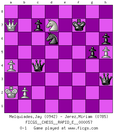Last move : 0-1 2011 October 18 5:9:28 [Event "FICGS__CHESS__RAPID_E__000057"] [Site "FICGS"] [Date "2011.07.05"] [Round "1"] [White "Melquiades,Jay"] [Black "Jerez,Miriam"] [Result "0-1"] [WhiteElo "0942"] [BlackElo "0785"] 1.e4 e5 2.Nf3 Nc6 3.c3 Nf6 4.d3 Be7 5.Bg5 O-O 6.Nbd2 d5 7.d4 dxe4 8.Nxe4 Nxe4 9.Bxe7 Qxe7 10.Qe2 exd4 11.cxd4 Bg4 12.h3 Bh5 13.g4 Bg6 14.h4 Rfe8 15.h5 Bxh5 16.gxh5 h6 17.Bg2 Rad8 18.O-O-O Nxd4 19.Nxd4 Qc5+ 20.Nc2 Rxd1+ 21.Rxd1 Nd6 22.Qg4 Nf5 23.Rg1 Qxf2 24.Bxb7 Nd6 25.Bc6 Qf6 26.Bxe8 Nxe8 27.Nd4 Kf8 28.Nb5 a6 29.Nd4 Nd6 30.Nb3 g5 31.Nc5 Kg8 32.Nd7 Qe7 33.Rg3 f5 34.Qa4 Qe1 35.Kc2 Qf2+ 36.Kb3 Qxg3+ 37.Kc2 f4 38.Qxa6 f3 39.Nf6+ Kf7 40.Nd7 Qh2+ 41.Kb3 f2 42.a4 Qh3 43.Ka2 f1Q 44.Qa7 Qc4+ 0-1 Ponziani : Jaenisch counter-attack Kingside Castling by player Black (move 5) Queenside Castling by player White (move 18) Promotion Queen by player Black (move 43) Player Black won this chess game. Follow this game move after move (download)You must take your opponent into a deep dark forest where 2+2=5, and the path leading out is only wide enough for one. (Mikhail Tal) Später, ... hatte ich zunehmend Erfolg in entscheidenden Partien. Vielleicht weil ich eine einfache Wahrheit erkannte: nicht nur ich hatte Angst, auch mein Gegner. (Mikhail Nekhemyevich Tal) El jugador táctico sabe que hacer cuando hay algo que hacer; mientras que el estratega sabe que hacer cuando no hay nada que hacer. (Gerald Abrahams) Les réformistes prétendent que les progrès de la théorie conduiront à la disparition des échecs, et qu'il faut, pour leur rendre vie, en remanier les règles. En réalité, qu'exprime cette affirmation? Le mépris de l'intuition, de l'imagination et de tous les autres éléments qui font des échecs un art. (Alexander Alekhine) There will be no order, only chaos. (Sol Robeson in Pi by Darren Aronofsky)