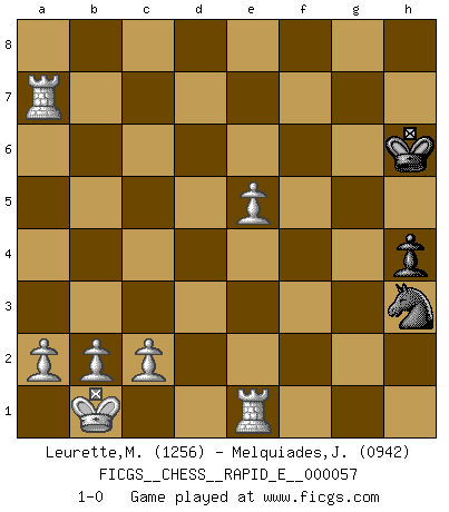 Last move : 1-0 2011 July 22 17:25:51 [Event "FICGS__CHESS__RAPID_E__000057"] [Site "FICGS"] [Date "2011.07.05"] [Round "1"] [White "Leurette,Marc-Antoine"] [Black "Melquiades,Jay"] [Result "1-0"] [WhiteElo "1256"] [BlackElo "0942"] 1.e4 e5 2.Nf3 d6 3.h3 Nf6 4.Nc3 Nbd7 5.d4 c6 6.dxe5 Nxe5 7.Nxe5 dxe5 8.Qxd8+ Kxd8 9.Bg5 Be7 10.O-O-O Bd7 11.f4 exf4 12.Bxf4 Nh5 13.g3 g5 14.Be2 gxf4 15.Bg4 Nxg3 16.Rxd7+ Ke8 17.Rhd1 h5 18.Bf5 f3 19.R7d3 Bg5+ 20.Kb1 Bf6 21.Rxf3 Bxc3 22.Rxc3 Ne2 23.Re3 Nf4 24.Rf3 Ng2 25.Rb3 b5 26.Bd7+ Kf8 27.Bxc6 Rc8 28.Bxb5 Rg8 29.Ba6 Re8 30.Bb7 f5 31.Rf3 Nh4 32.R3f1 Ng2 33.Rxf5+ Kg7 34.Bd5 Kh6 35.Bxg8 Rxg8 36.Rg1 Rg5 37.Rxg5 Nf4 38.Ra5 Nxh3 39.Ra6+ Kh7 40.Rxa7+ Kh6 41.Re1 h4 42.e5 1-0 Philidor's defense Queenside Castling by player White (move 10) 10 pieces endgame at move 40 : White KRRPPPP , Black KNP WHITE : King + 2 Rooks 4 Pawns BLACK : King + 1 Knight 1 Pawn Player White won this chess game. Follow this game move after move (download)One doesn't have to play well, it's enough to play better than your opponent. (Siegbert Tarrasch) Nie in meinem Leben habe ich die französische Verteidigung gespielt, welche die Stumpfsinnigste von allen ist. (Wilhelm Steinitz) Evita las multitudes. Haz independientemente tu propio razonamiento. Trata de ser el jugador de Ajedrez, no la pieza de Ajedrez. (Ralph Charell) Ne tendez aucun piège pour le plaisir ! Ne jouez rien dans l'espoir que l'adversaire réagisse de façon stupide ! Prenez toujours pour acquis que l'adversaire va trouver le meilleur coup ! Ne jouez jamais de coup dans l'espoir que l'adversaire ne voie pas la menace ! Chacun de vos coups doit améliorer la position d'une façon ou d'une autre. We cannot be sure of having something to live for unless we are willing to die for it. (Ernesto Che Guevara)
