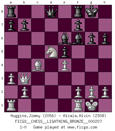 Last move : 1-0 2011 July 5 23:22:25 [Event "FICGS__CHESS__LIGHTNING_BRONZE__000207"] [Site "FICGS"] [Date "2011.07.05"] [Round "1"] [White "Huggins,Jimmy"] [Black "Alcala,Alvin"] [Result "1-0"] [WhiteElo "2056"] [BlackElo "2308"] 1.d4 Nf6 2.c4 Nc6 3.Nf3 e6 4.a3 d6 5.Nc3 g6 6.e4 Bg7 7.d5 Ne5 8.Nxe5 dxe5 9.Be2 exd5 10.cxd5 O-O 11.Bg5 c6 12.O-O cxd5 13.Nxd5 Be6 14.Bc4 h6 15.Bxf6 Bxf6 16.Qb3 1-0 This chess game has been lost on time (started : 2011.07.05 22:26:49) Kevitz-Trajkovich defense Kingside Castling by player Black (move 10) Kingside Castling by player White (move 12) Player White won this chess game. Follow this game move after move (download)When your house is on fire, you can't be bothered with the neighbors. Or, as we say in Chess, if your King is under attack you don't worry about losing a Pawn on the Queen's side. (Gary Kasparov) Viele Opfer benötigen überhaupt keine konkrete Berechnung. Es genügt sich die entstehende Position kurz vorzustellen, um uns davon zu überzeugen, dass das Opfer korrekt ist. (Mikhail Nekhemyevich Tal) Los finales de Peón son del Ajedrez lo que el cesped es del Golf. (Cecil Purdy) À la honte des hommes, on sait que les lois du jeu sont les seules qui soient partout justes, claires, inviolables et exécutées. Pourquoi l'Indien qui a donné les règles du jeu d'échecs est-il obéi de bon gré dans toute la terre, et que les décrétales des papes, par exemple, sont aujourd'hui un objet d'horreur et de mépris ? C'est que l'inventeur des échecs combina tout avec justesse pour la satisfaction des joueurs, et que les papes, dans leurs décrétales, n'eurent en vue que leur seul avantage. L'Indien voulut exercer également l'esprit des hommes et leur donner du plaisir; les papes ont voulu abrutir l'esprit des hommes. Voltaire (Dictionnaire philosophique / Garnier 1967) Drag your thoughts away from your troubles... by the ears, by the heels, or any other way you can manage it. (Mark Twain)