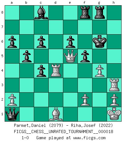 Last move : 1-0 2011 July 27 18:39:31 [Event "FICGS__CHESS__UNRATED_TOURNAMENT__000018"] [Site "FICGS"] [Date "2011.07.06"] [Round "1"] [White "Parmet,Daniel"] [Black "Riha,Josef"] [Result "1-0"] [WhiteElo "2079"] [BlackElo "2022"] 1.d4 Nf6 2.c4 c6 3.Nc3 d5 4.Nf3 e6 5.Bg5 dxc4 6.e4 b5 7.e5 h6 8.Bh4 g5 9.Nxg5 hxg5 10.Bxg5 Be7 11.exf6 Bxf6 12.Bxf6 Qxf6 13.g3 Bb7 14.Bg2 Na6 15.Ne4 Qe7 16.O-O f5 17.Nc5 Nxc5 18.dxc5 Qxc5 19.Re1 Kf7 20.Qe2 Qe7 21.Rad1 Rae8 22.Bf3 Kg6 23.Qe5 Qf6 24.Qc5 Qxb2 25.Rd4 Qc3 26.Re3 Qa1+ 27.Bd1 Bc8 28.g4 Rhg8 29.Kh1 Ref8 30.Rh3 a6 31.Qe5 1-0 Queen's pawn game Kingside Castling by player White (move 16) Player White won this chess game. Follow this game move after move (download)Discovered check is the dive bomber of the Chessboard. (Reuben Fine) Ich habe die besten Aussichten, den ersten Preis zu gewinnen - denn jeder muss gegen Steinitz spielen, nur ich nicht! (Wilhelm Steinitz) Haz el enroque temprano y seguido. (Rob Sillars) Vous savez, camarade Pachman, je n'éprouve pas de plaisir à être ministre, je jouerais plutôt aux échecs comme vous, ou alors ferais une révolution au Venezuela. (Che Guevara à Ludek Pachman, 'Checkmate in Prague', 1975) I'm extremely disappointed. I send you out for exciting, new designer drugs, you come back with tomato sauce. (Gregory House, House M.D.)