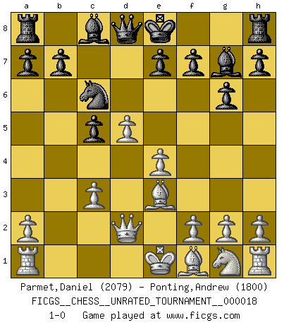 Last move : 1-0 2011 September 1 10:12:42 [Event "FICGS__CHESS__UNRATED_TOURNAMENT__000018"] [Site "FICGS"] [Date "2011.07.06"] [Round "1"] [White "Parmet,Daniel"] [Black "Ponting,Andrew"] [Result "1-0"] [WhiteElo "2079"] [BlackElo "1800"] 1.d4 Nf6 2.c4 g6 3.Nc3 d5 4.cxd5 Nxd5 5.e4 Nxc3 6.bxc3 Bg7 7.Be3 c5 8.Qd2 Nc6 9.d5 1-0 This chess game has been lost on time (started : 2011.07.06 17:6:34) King's Indian defense, 3.Nc3 Player White won this chess game. Follow this game move after move (download)Chess is above all, a fight ! (Emanuel Lasker) Glücklicherweise sind Großmeister Ruben Fines reine Schachbücher weniger phallozentrisch [als seine Schachpsychologie] und deswegen auch weniger lächerlich. (Nigel Short) Una mala movida nulifica cuarenta buenas. (Horowitz) Les Echecs représentent une sphère d'idées créatrices basée sur la volonté des deux protagonistes. (Smyslov) Never risk one's whole fortune unless supported by one's entire army. (Niccolo Machiavelli)