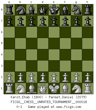 Last move : 0-1 2011 August 15 21:30:24 [Event "FICGS__CHESS__UNRATED_TOURNAMENT__000018"] [Site "FICGS"] [Date "2011.07.06"] [Round "1"] [White "Karot,Ehab"] [Black "Parmet,Daniel"] [Result "0-1"] [WhiteElo "1800"] [BlackElo "2079"] 0-1 This chess game has been lost on time (started : 2011.07.06 17:6:34) Player Black won this chess game. Follow this game move after move (download)Bobby Fischer is the greatest Chess player who has ever lived. (Ken Smith) Im Internet Chess Club betrug mein Rating vorübergehend 3350 ELO-Punkte. (Sergej Karjakin) Alguna parte de un error es siempre correcto. (Savielly Tartakover) Les Echecs ont trois composantes : le temps, l'espace et le matériel en dernier. (Mikhail Tal) There are two kinds of people in the world, my friend. Those who have a loaded gun and those who dig. You dig ! (Blondie in The Good, The Bad and The Ugly)