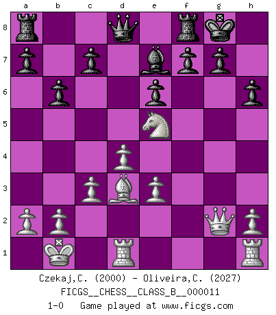 Last move : 1-0 2007 January 13 20:51:57 [Event "FICGS__CHESS__CLASS_B__000011"] [Site "FICGS"] [Date "2006.12.26"] [Round "1"] [White "Czekaj,Christophe"] [Black "Oliveira,Carlos"] [Result "1-0"] [WhiteElo "2000"] [BlackElo "2027"] 1.d4 e6 2.e4 d5 3.Nd2 dxe4 4.Nxe4 Nd7 5.Nf3 Ngf6 6.Nxf6+ Nxf6 7.c3 Be7 8.Bd3 O-O 9.Qc2 h6 10.Be3 b6 11.O-O-O Bb7 12.Ne5 Nd5 13.Kb1 Nxe3 14.fxe3 Bxg2 15.Qxg2 1-0 Queen's pawn Kingside Castling by player Black (move 8) Queenside Castling by player White (move 11) Player White won this chess game. Follow this game move after move (download)Later, I began to succeed in decisive games. Perhaps because I realized a very simple truth: not only was I worried, but also my opponent. (Mikhail Tal) Irgendwie scheint mir sonntags früh um 9 Uhr der Killerinstinkt verloren gegangen zu sein. (Alexej Shirov) Después de la respuesta de las negras a 1.e4 con 1..e5, se quedan siempre tratando de entrar dentro del juego. (Howard Staunton) Botvinnik disait en comparant les échecs à la musique: Il existe une science dont le but est l'étude de l'acoustique et des sons. Mais il y a aussi un art qui se sert de l'océan des sons : c'est la musique. De toute évidence, il en est de même pour la pensée. La logique est l'étude des lois de la réflexion et les échecs reflètent, en tant qu'art, le côté logique de la réflexion, sous la forme d'images artistiques... Extrait de Fischer - Spassky, Reykjavik 1972 par Alexander & F. Wyndham (Ed. Solar), p 37. Imagination is more important than knowledge. Knowledge is limited. Imagination encircles the world. (Albert Einstein)